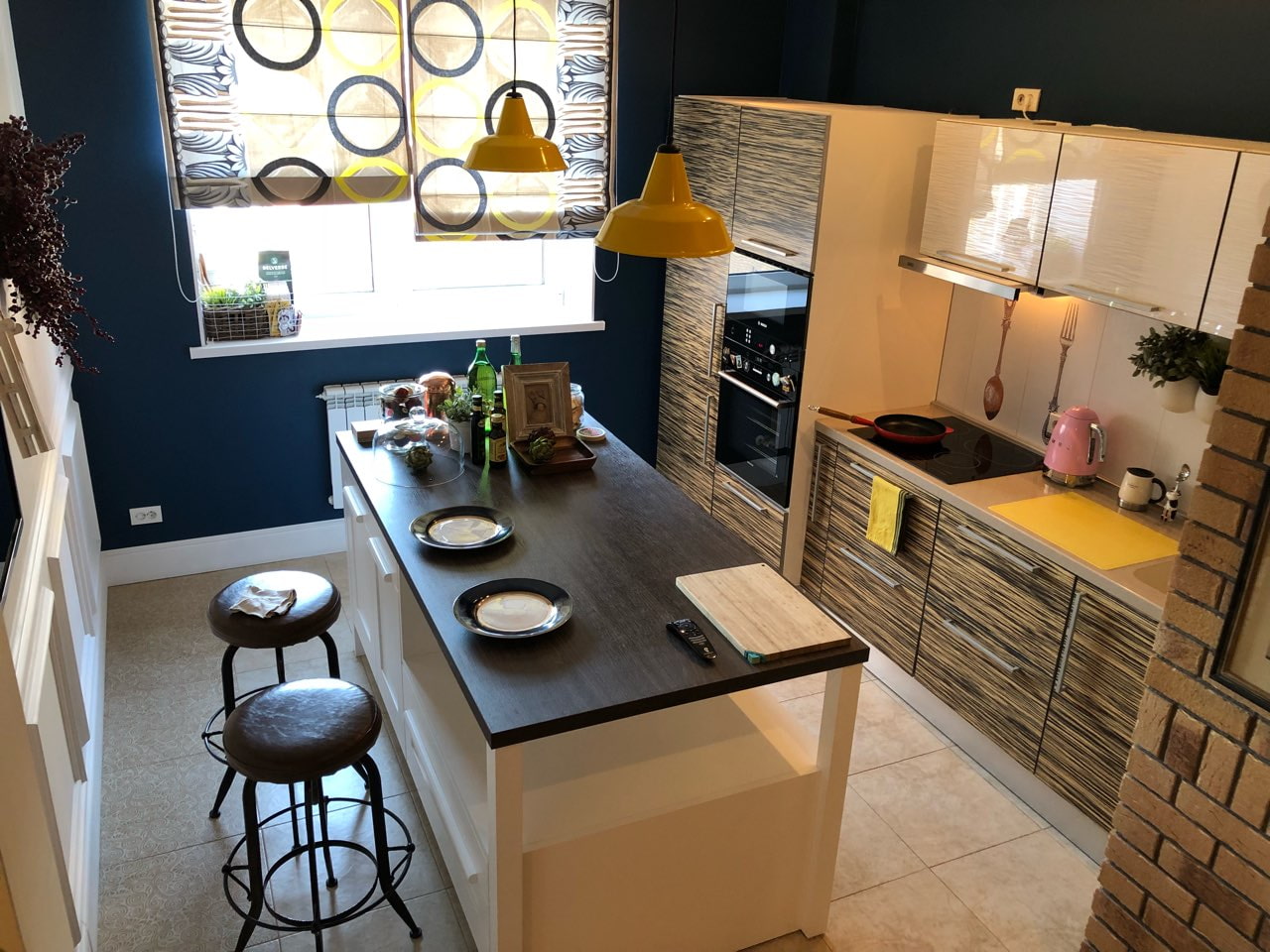 In the photo there is a spacious kitchen in an apartment of 60 sq. meters with an island in the middle.