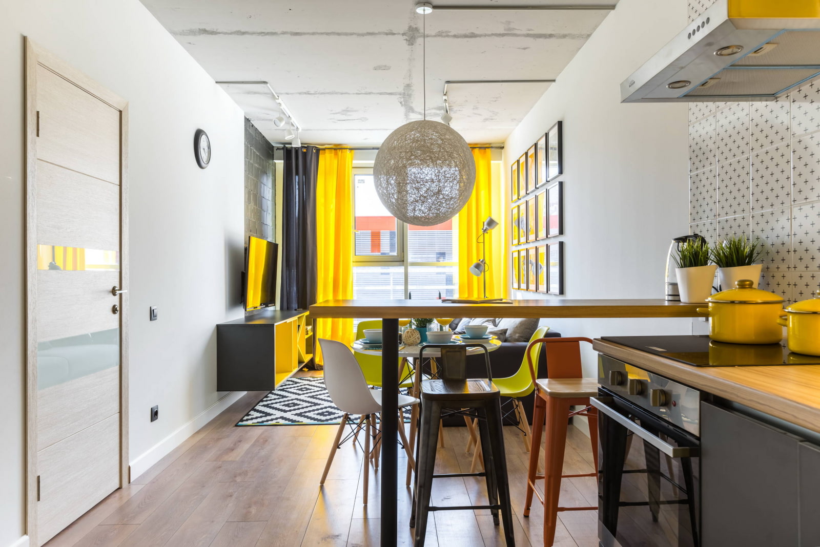 Free planning assumes a uniform design throughout the space. Open areas should not be overloaded with decor, otherwise the effect of spaciousness will disappear. It is recommended to divide each zone with a partition or furniture: this will add comfort. The kitchen-studio must be equipped with an extractor hood so that odors are not absorbed into the textiles. If you decorate the interior in milky colors, the apartment flooded with light will seem even larger.