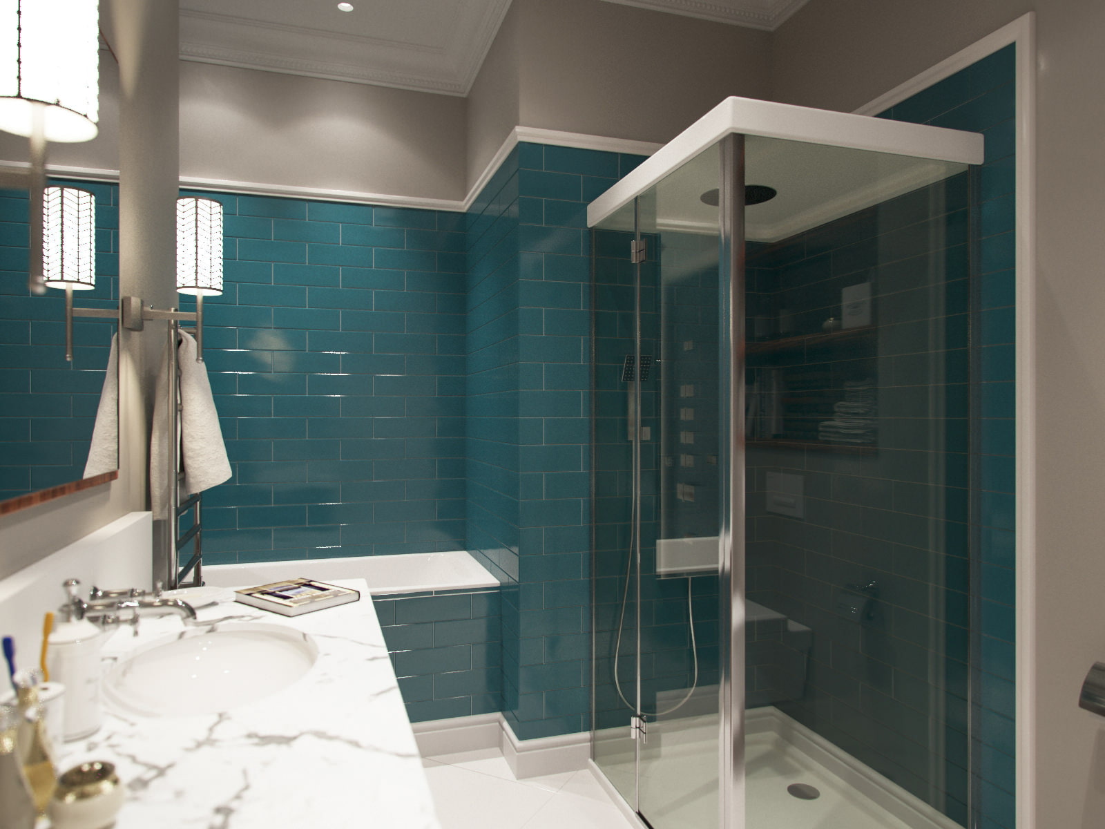 The discreet design of the apartment is 77 sq. m in the bathroom becomes brighter and more expressive due to the use in wet areas of Fap Ceramiche, Manhattan Jeans, saturated in color, navy blue tiles. The white border surrounding the display is in harmony with the white color of the bath tub and the ceiling of the shower stall.