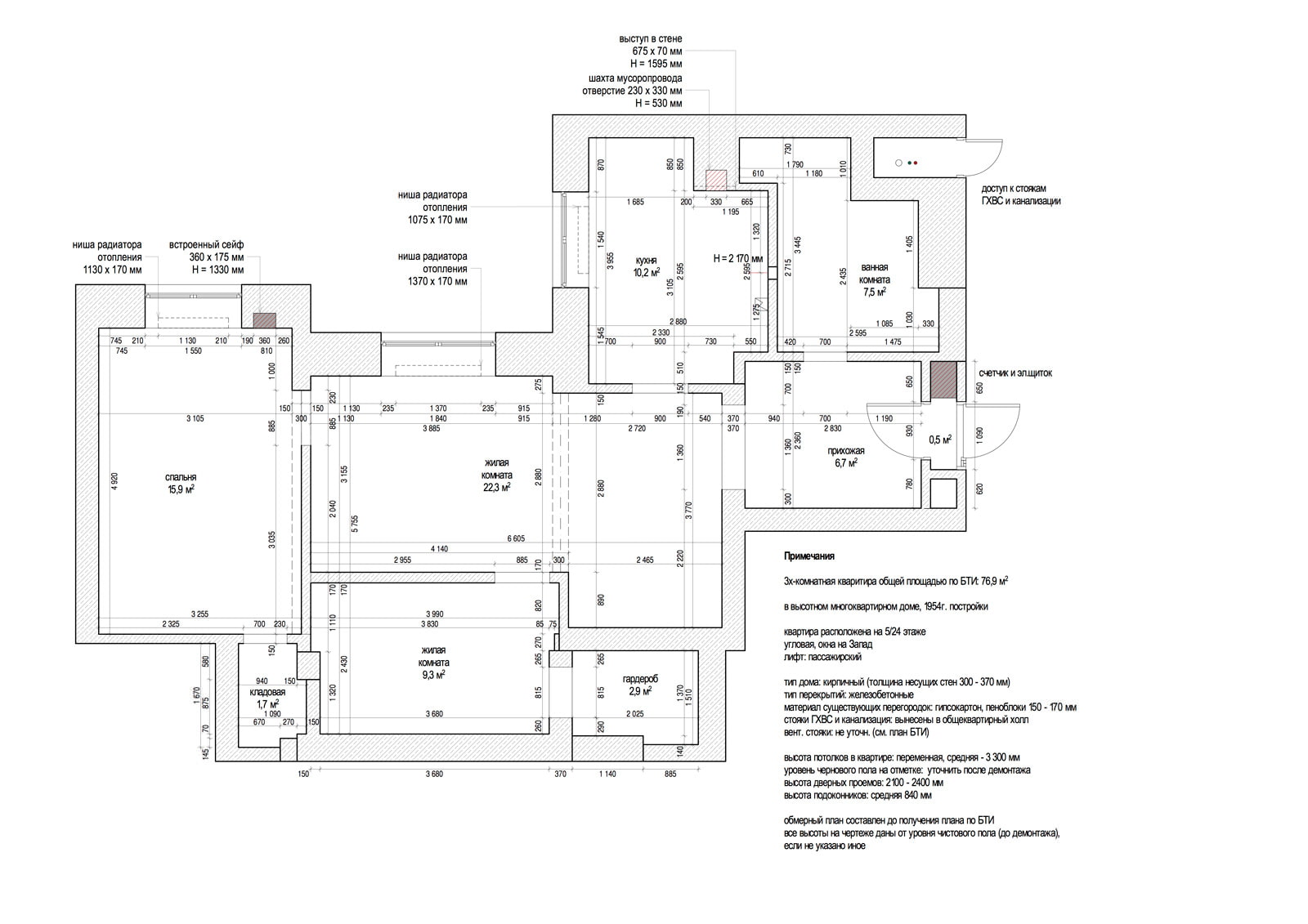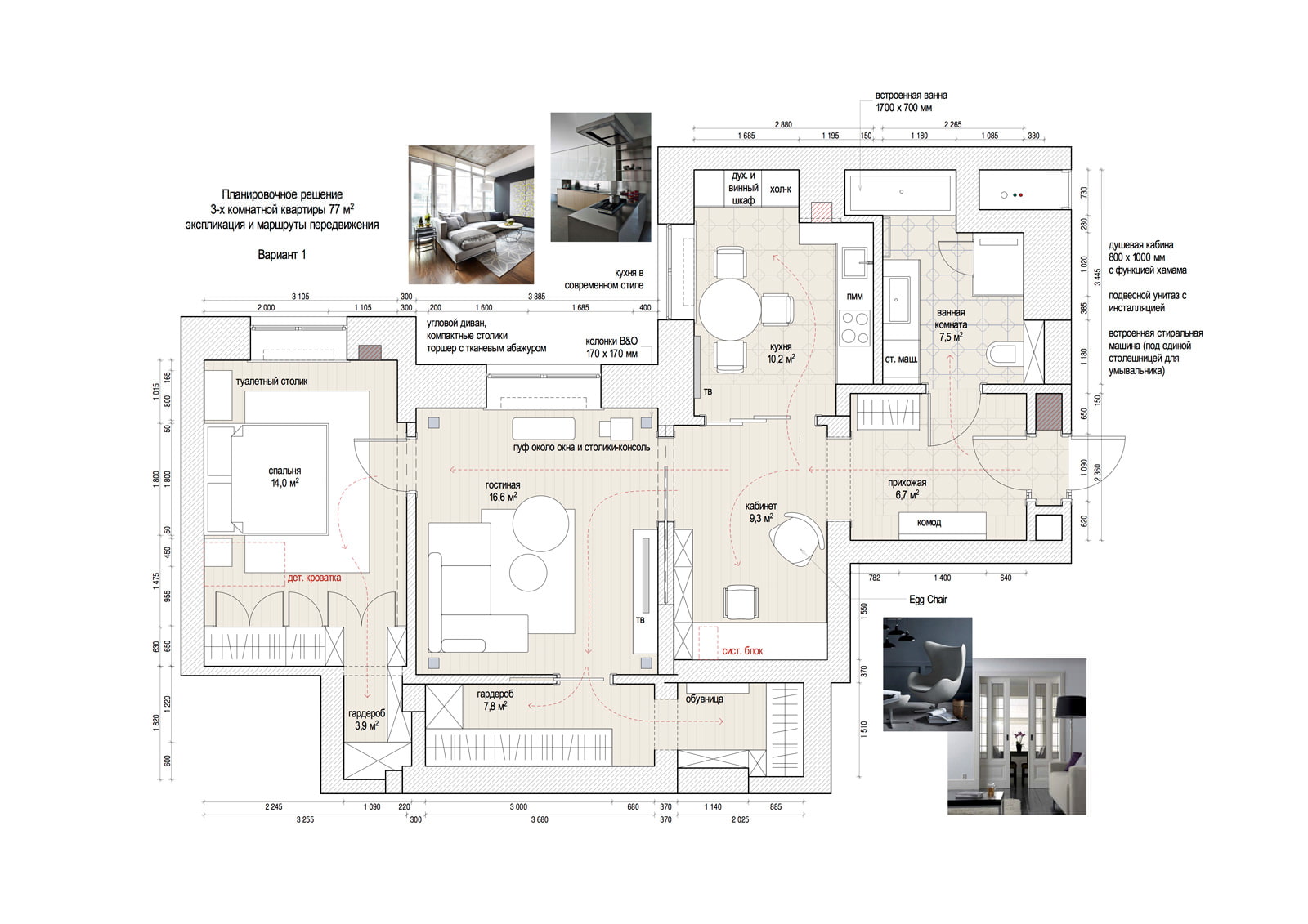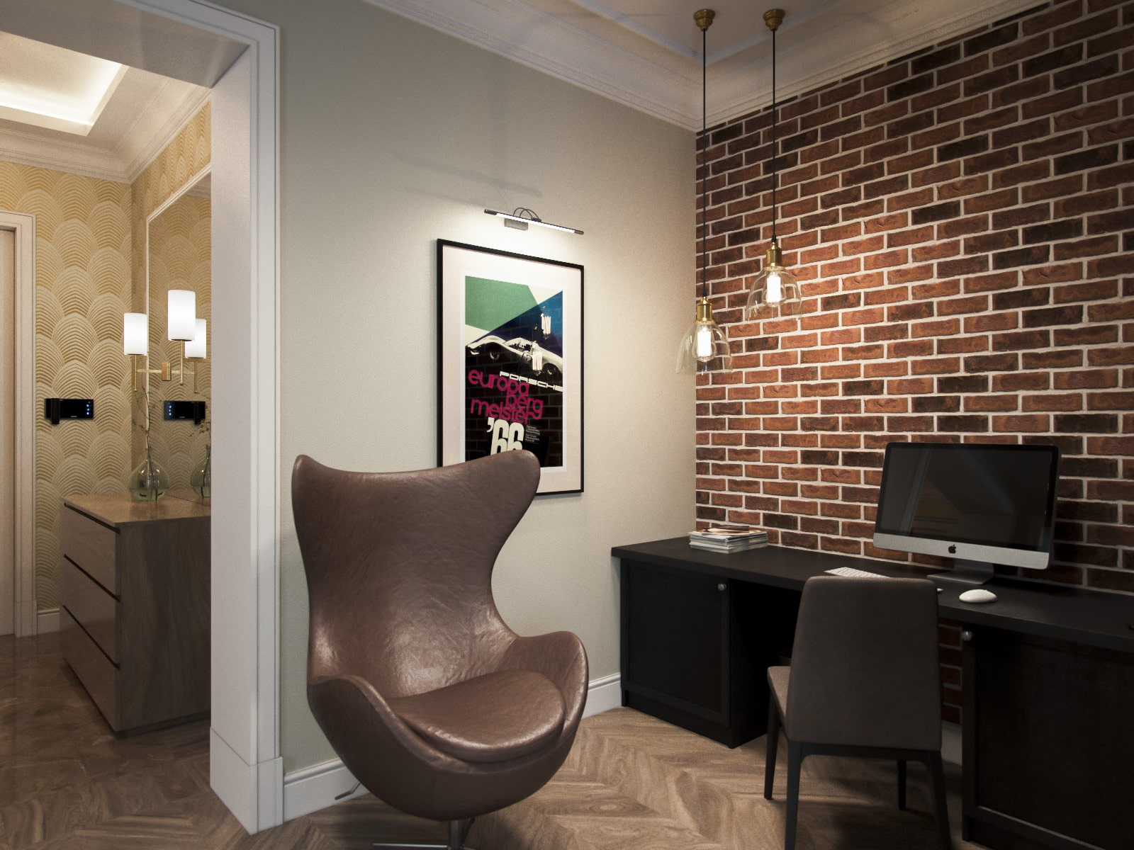 The design of the apartment is 77 sq. m. there is a small study for the owner. It is connected to the entrance area by an open opening, and is separated from the living room and kitchen-dining room by sliding doors with French glazing.