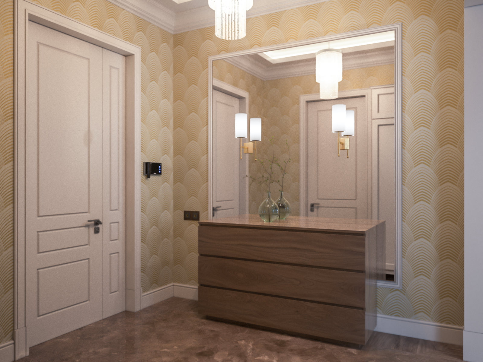 The new owners of the apartment liked the modern classic style, which they decided to use when decorating the premises. At the same time, the furnishings and lighting fixtures were selected both in a modern style and in a retro style.