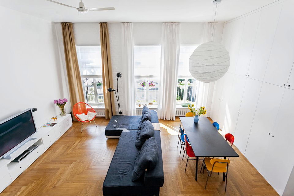 The interior of the apartment is 64 sq. m. are decorated with chairs from the flea market, colored chairs from the French school, as well as paintings by artists who are friends of the owners.
