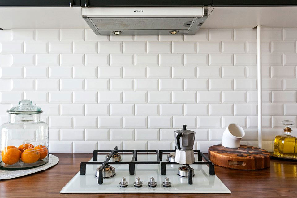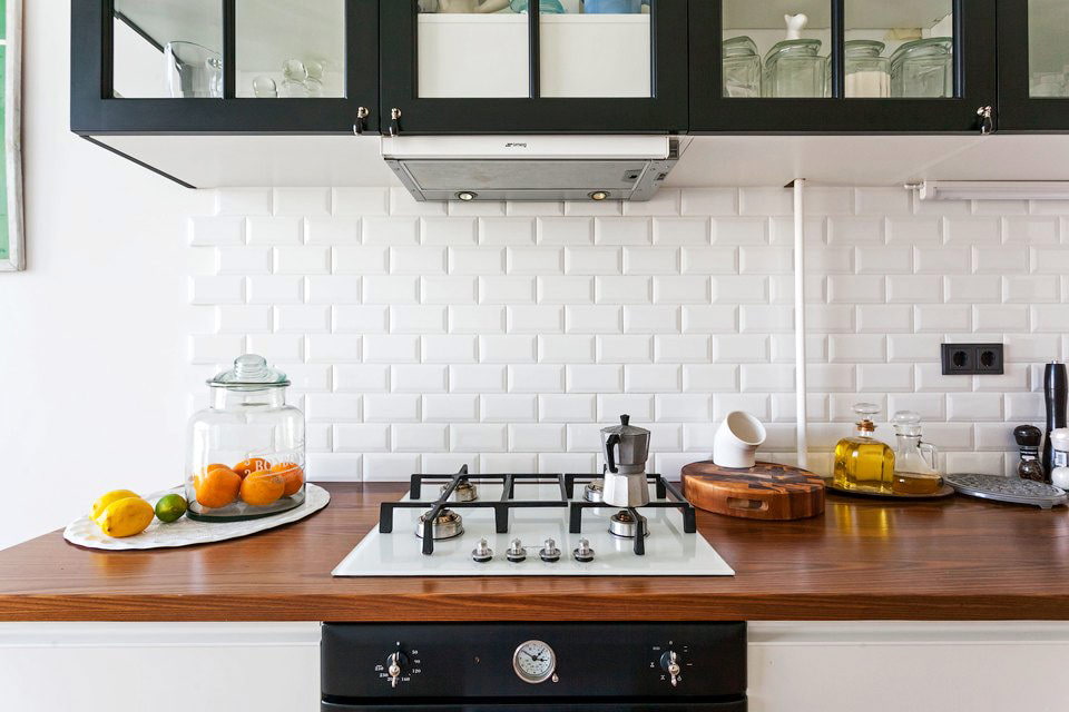 Kitchen furniture for apartment design with high ceilings made specially. Everything needed was removed into the floor cabinets, and dishes and souvenirs were placed in the wall cabinets.