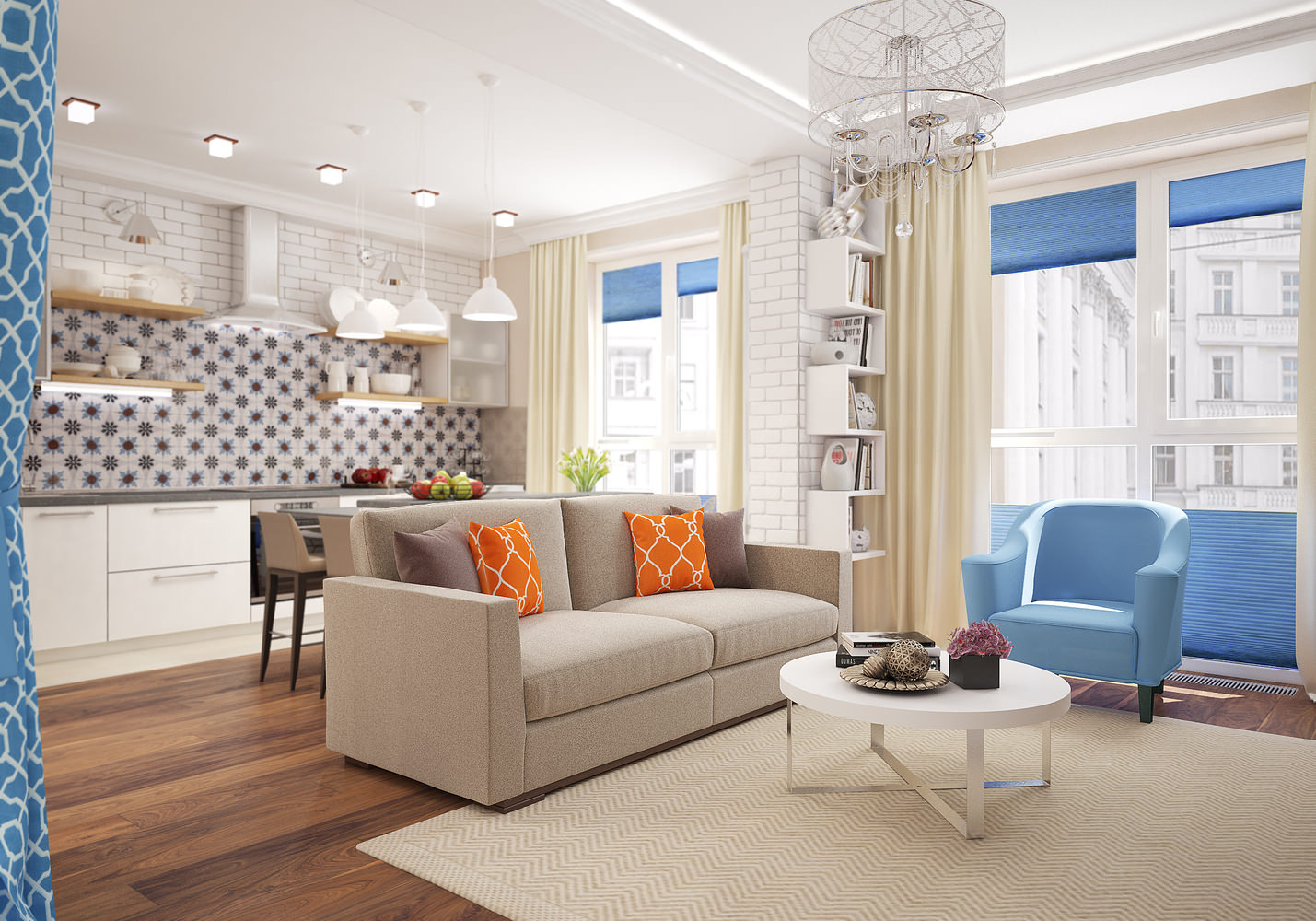 Light walls help to visually expand the volume of the room. Blue as a complementary color adds freshness and lightness, while orange accents - sofa cushions - bring brightness and liveliness to the interior of the studio.
