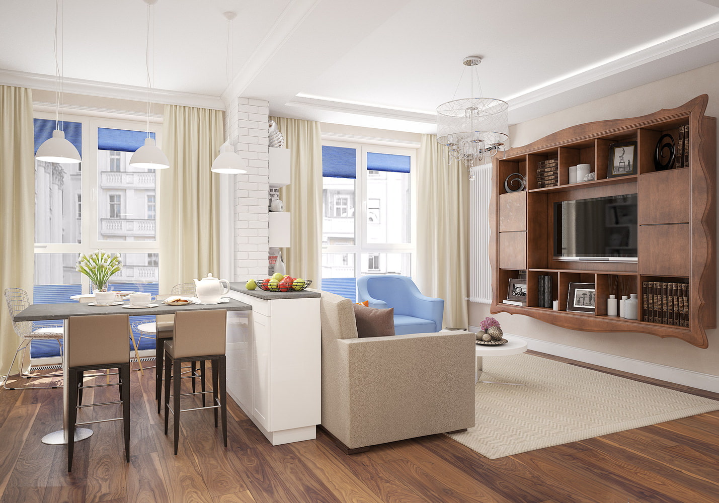 The entrance to the studio is combined with the entrance to the bathroom and leads to the kitchen-dining room. The living area with a place for watching TV programs is separated from the kitchen by a high desk-island, which is adjoined by a bar counter. The bedroom in the design of a studio apartment is located in a separate niche and is separated from the living room with a blackout curtain.