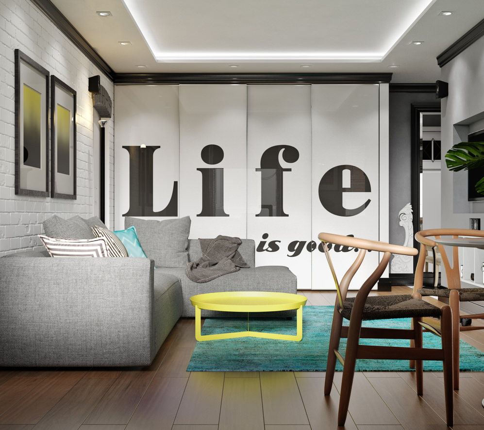 The built-in storage system looks like a part of the wall, on which a large inscription is applied - this does not violate the integrity of the interior design. The partition on which the TV panel is located separates the living room and kitchen areas. The color accent in the design is a turquoise carpet on the living room floor.
