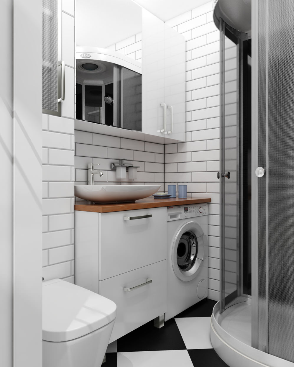 In the Khrushchev apartment, a small bathroom contains a corner shower, a hanging toilet, a cabinet with a sink and a built-in washing machine, as well as two spacious storage systems above the sink and toilet.