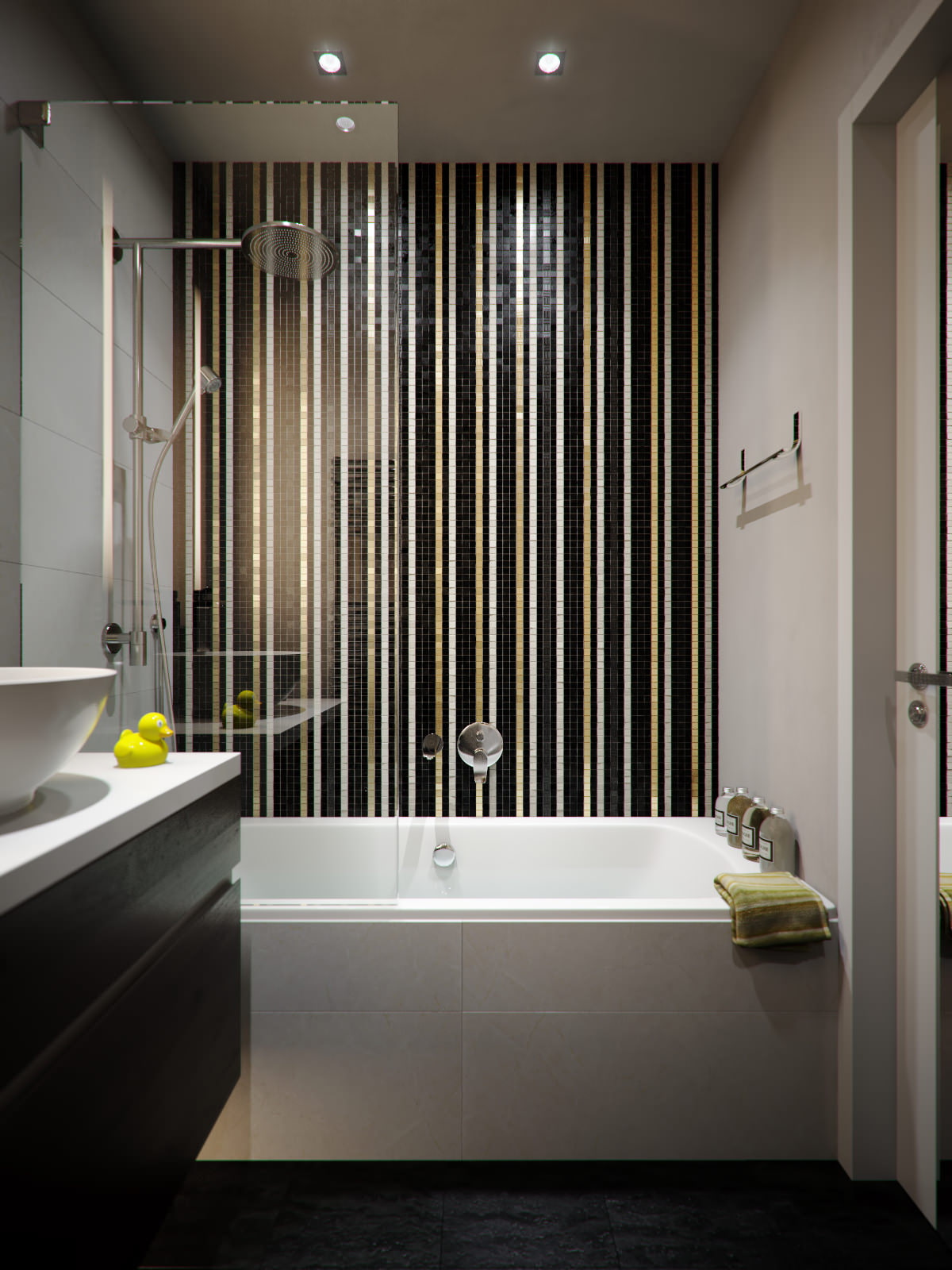 The bath bowl is separated from the wash area by a glass partition.Under the sink, on an artificial stone countertop, there is a cabinet made according to the designers' drawings, very convenient to use: the drawers are opened with a simple push.The wenge-colored curbstone is in harmony with the floor in tone, and so that it does not seem too bulky, a strip of LEDs was laid from below: due to the backlight, the effect of the object floating in the air is created.