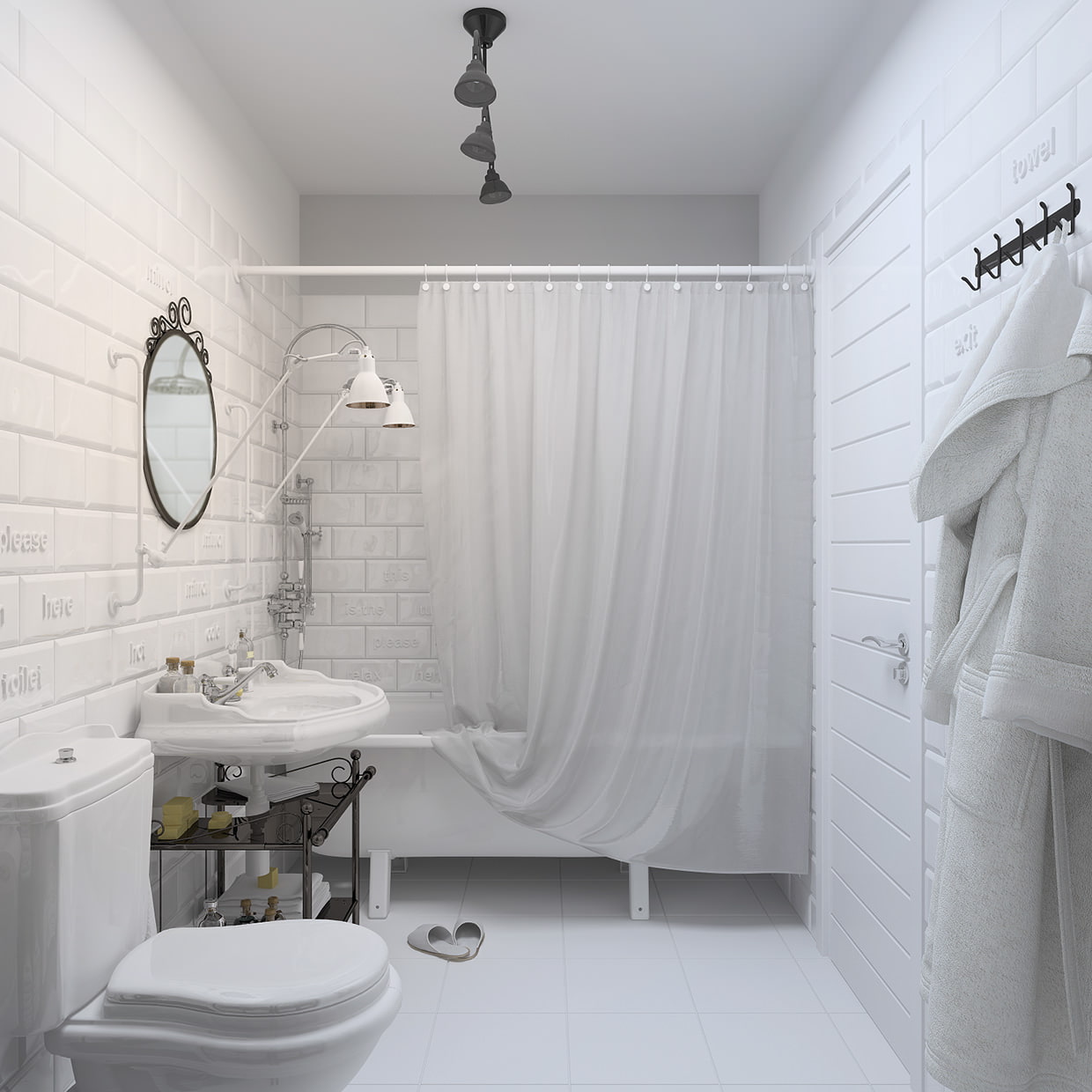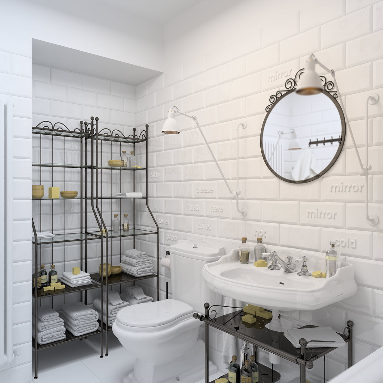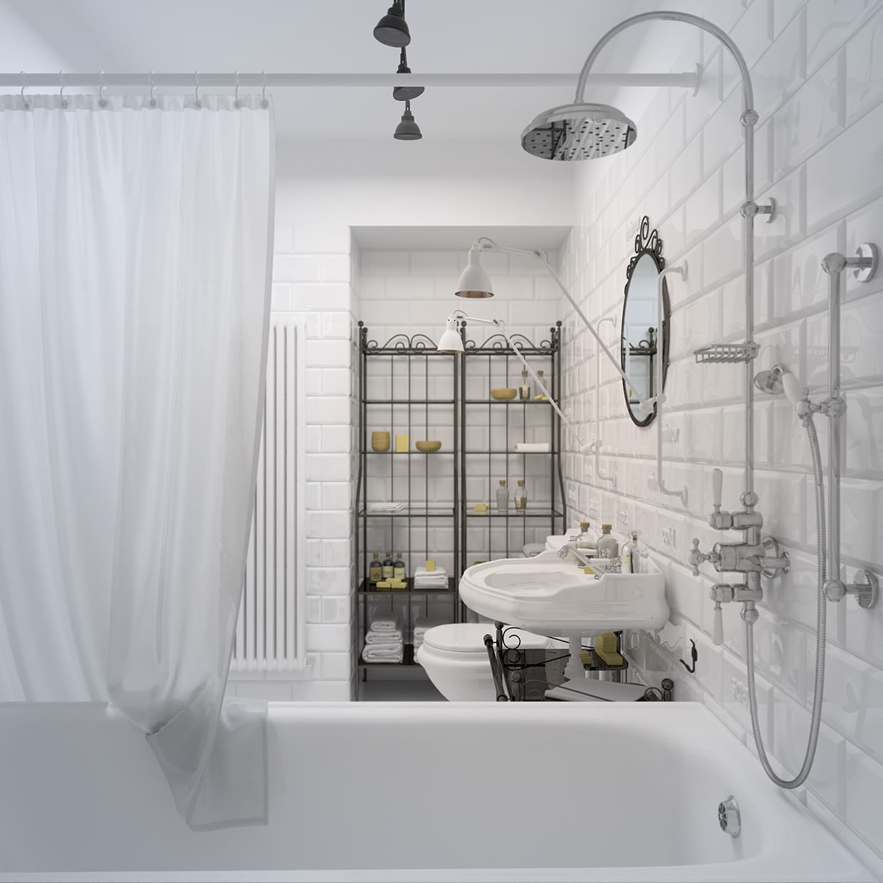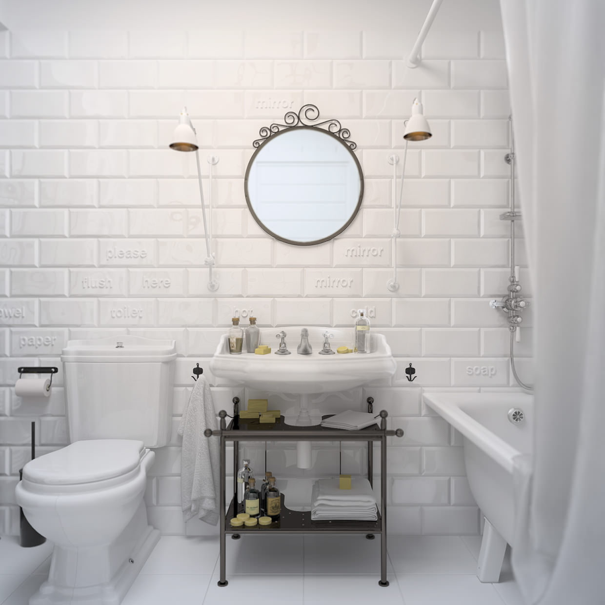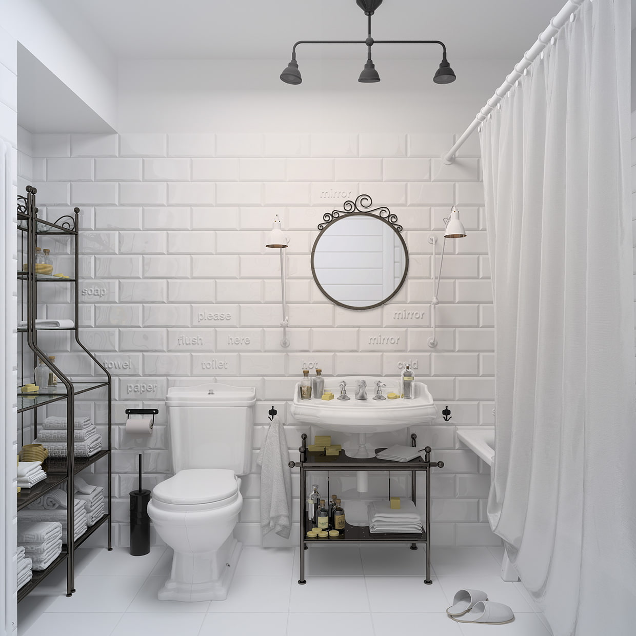 In the design of a one-room apartment, white trim with embossed brickwork and graceful metal shelving give the bathroom a luxurious look.