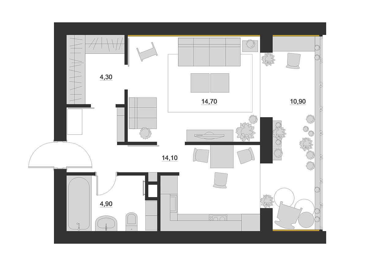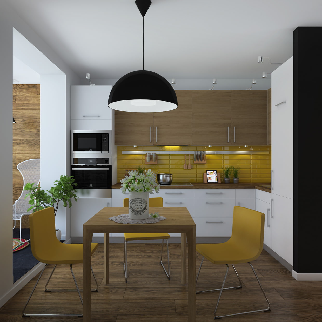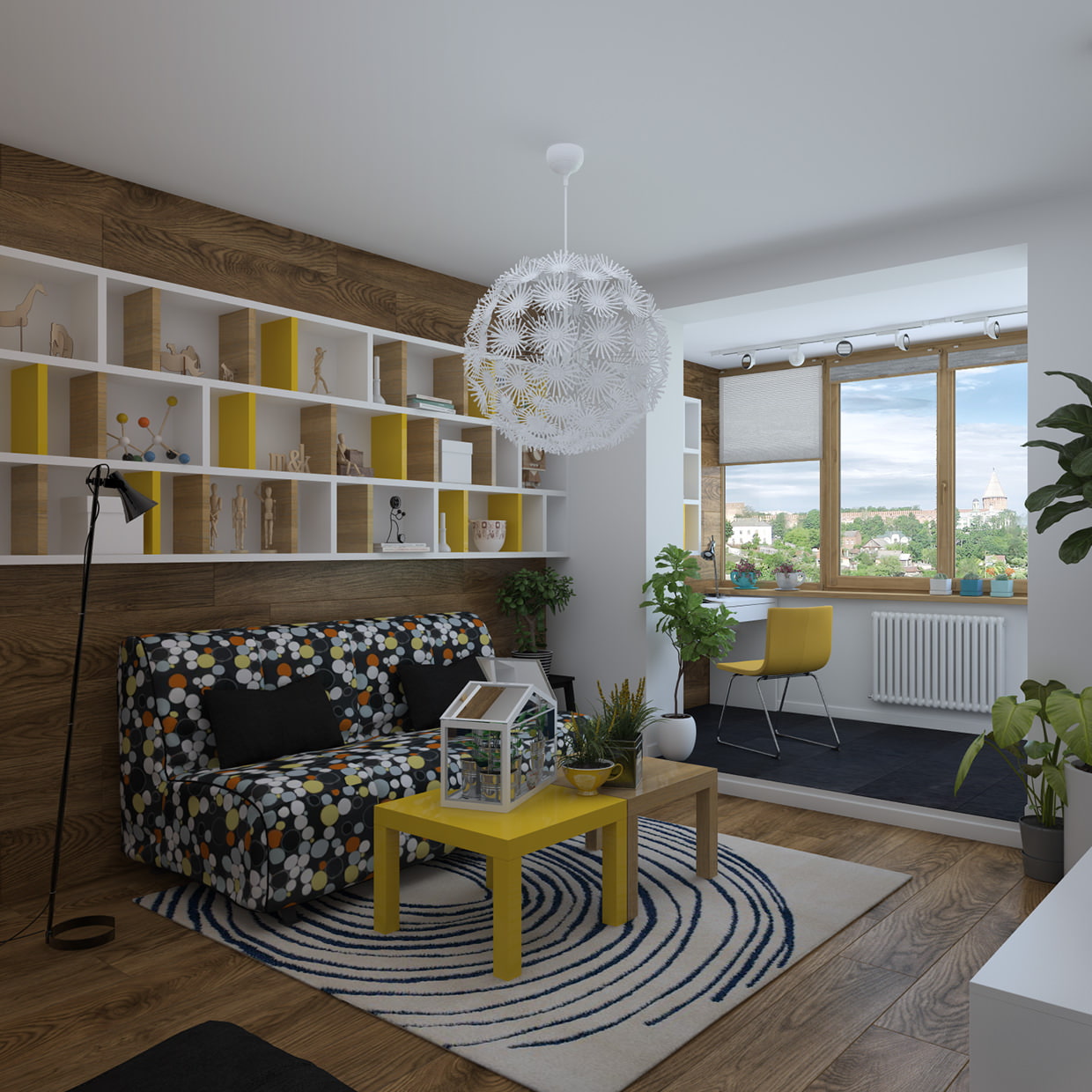 The interior is designed in a Scandinavian style with minimalist features. An unconventional approach to the use of black and yellow accents gave the design of a one-room apartment freshness and novelty.