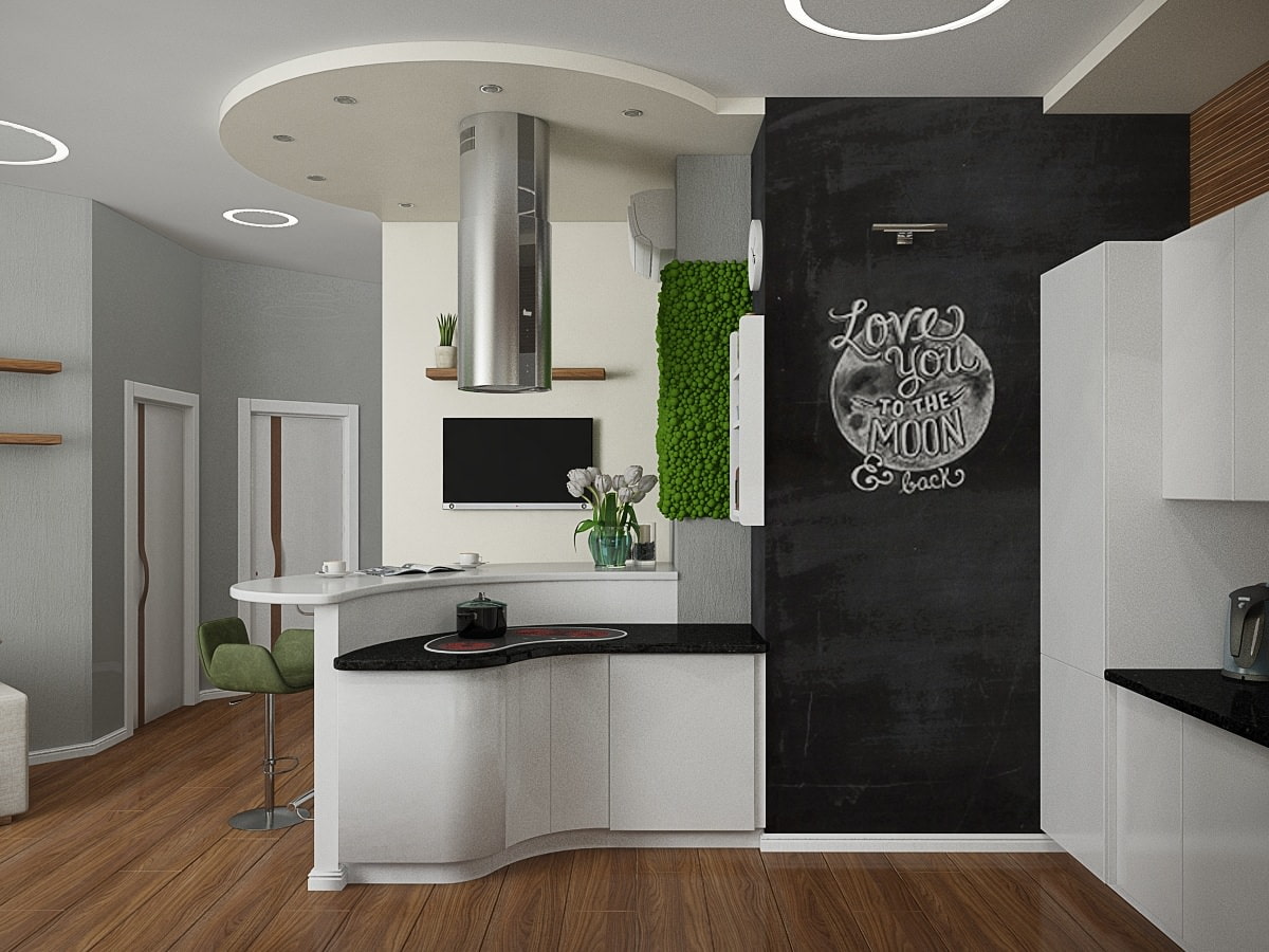 Standing at the stove, the hostess can watch TV and communicate with guests sitting at the bar. The unusual shape of the hob is separated from the refrigerator by a slate wall - here it will be convenient to write down a recipe, or leave a note for your child.