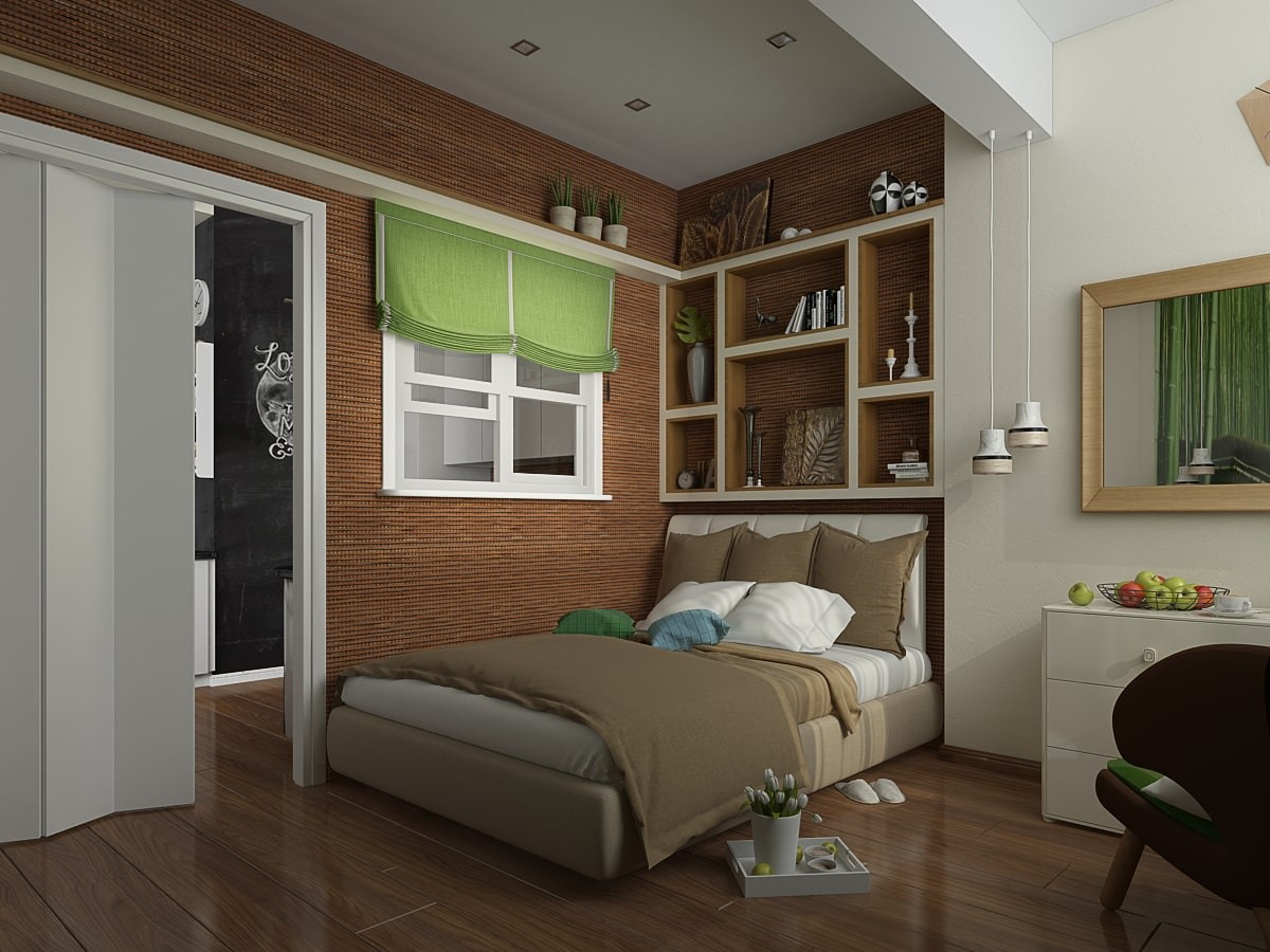 It was possible to expand the bedroom and even organize a small dressing room in it by joining a balcony to the living area. Like the rest of the premises, it is designed in an eco-style; natural materials and colors of finishing create a feeling of natural purity and comfort.