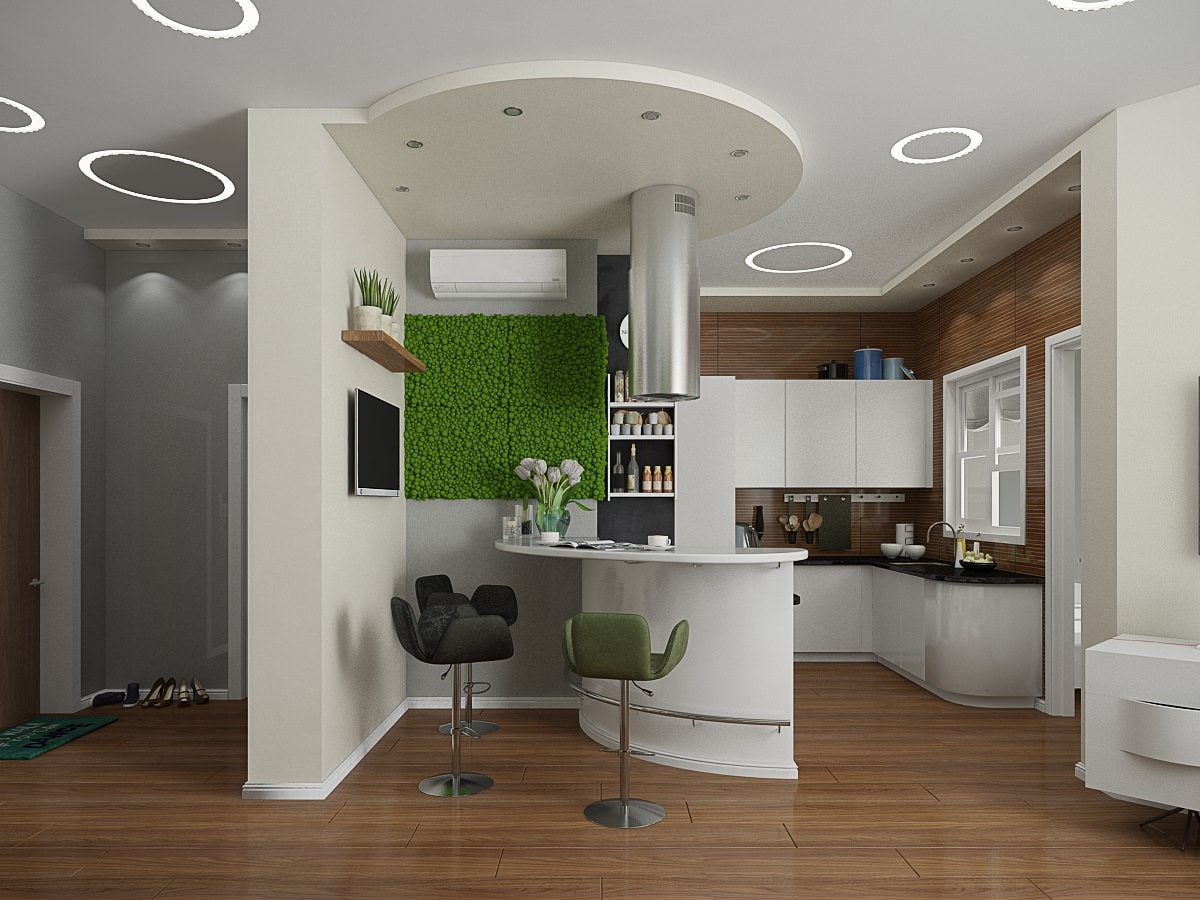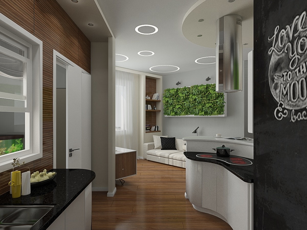 The eco-direction was chosen as the main style in the interior design project of the apartment. In the decoration of the kitchen-living room, these are, first of all, moss phytowalls above the sofa and dining areas, as well as the color combination of finishing materials.