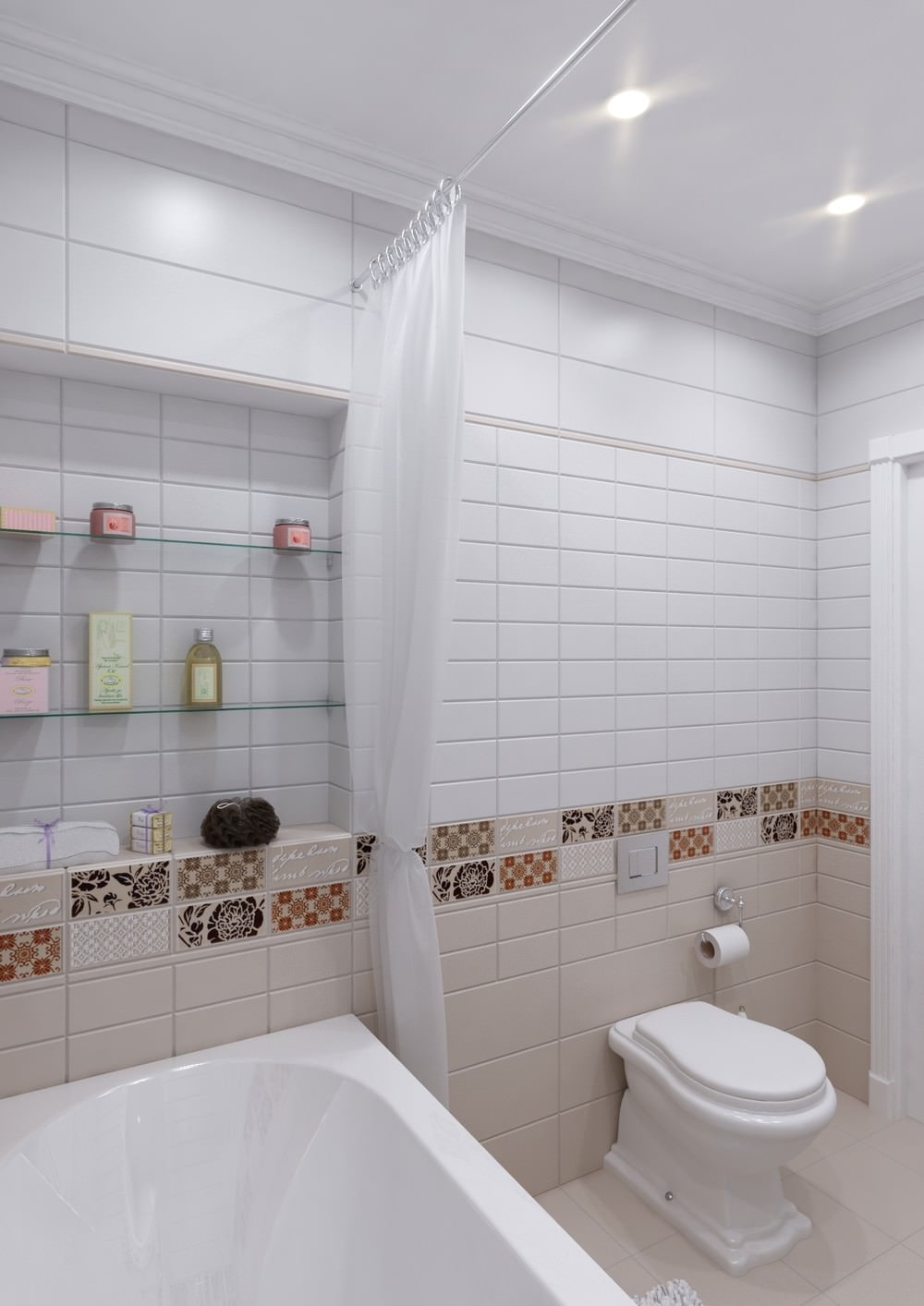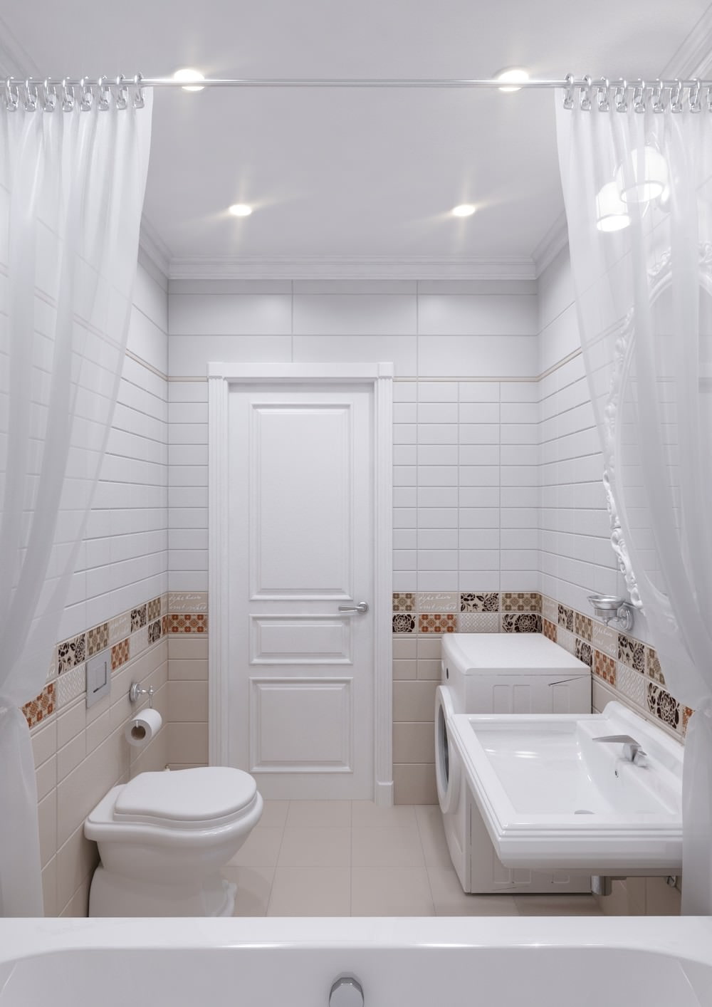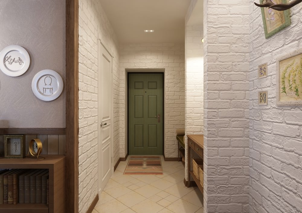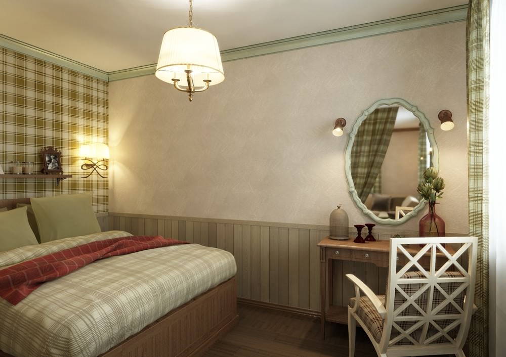 The main decorative elements in the project are natural fabrics with a check pattern, which is most characteristic of the country style. In addition, decorative bricks were used in the decoration of the hallway, and patterned ceramic tiles were used in the bathroom and in the kitchen. Additionally, the apartment was decorated with bunches of dry grass and wrought metal elements.