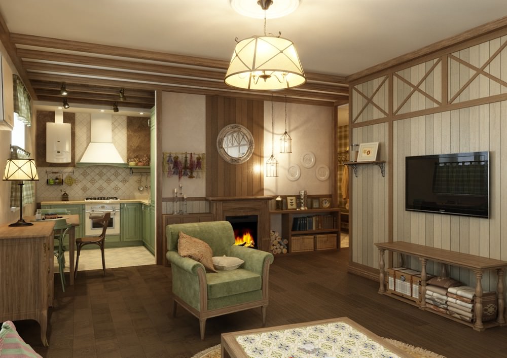 The style has many directions: American country, Russian country style, Provence and others. Despite some differences, it is possible to distinguish features common to all: the use of wooden beams on the ceiling, forged metal elements, simple patterns of fabrics (cage, strip). Another unifying detail: a fireplace as the main decoration of the interior.
