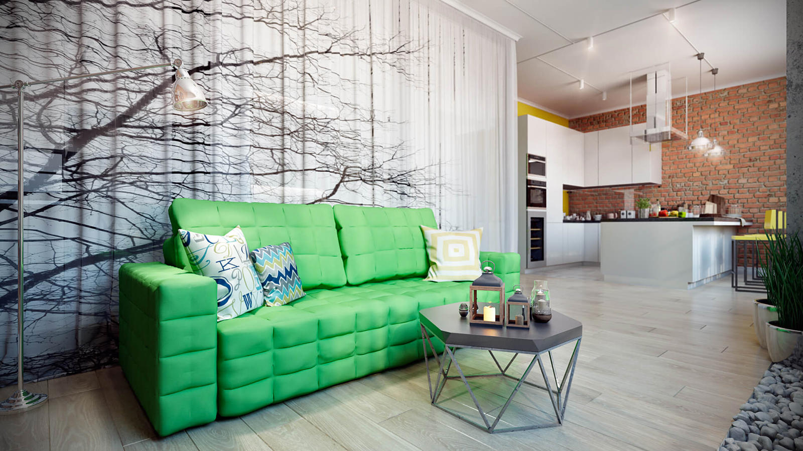 Between the living room and bedroom areas there is a movable glass partition, along which a thick curtain with a black and white image of a tree moves.