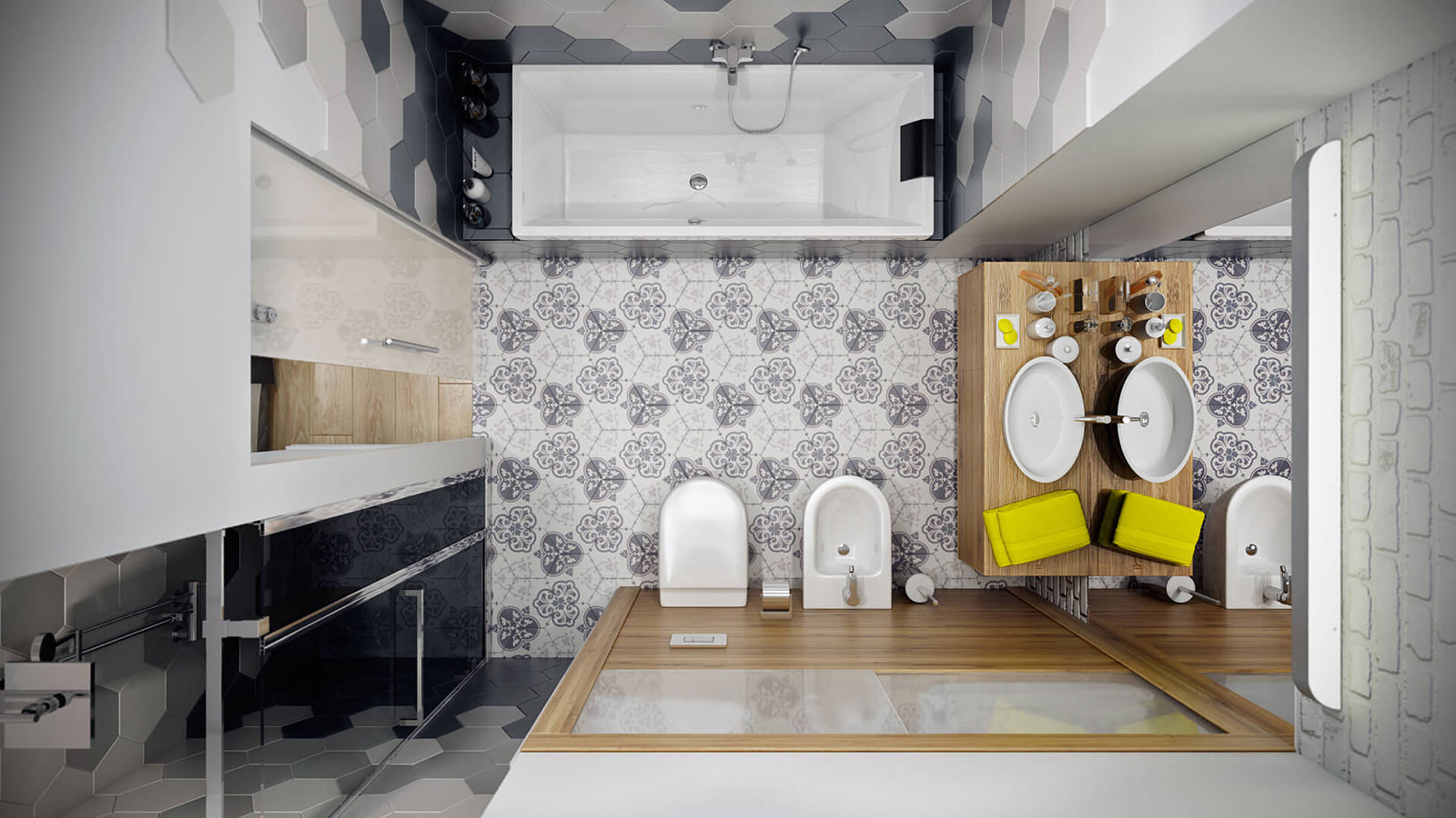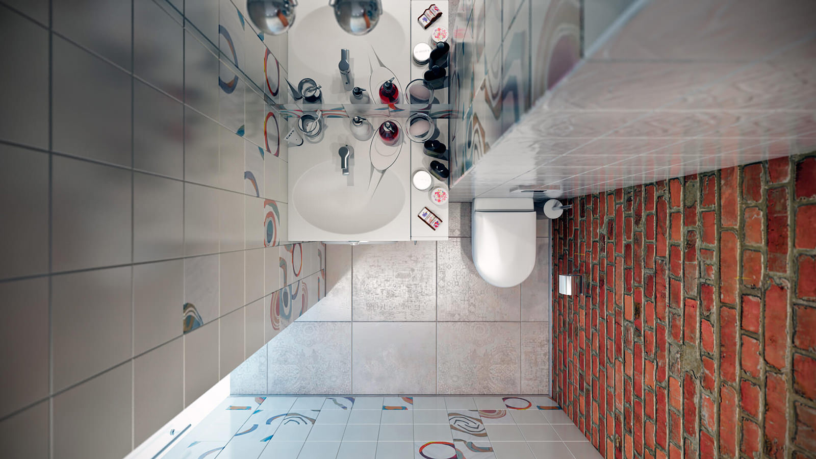 Constructivism introduced bright colors of geometric patterns in the entrance area and on the tiles in the decoration of the walls of the guest bathroom. These elements give the interior dynamism and freshness.