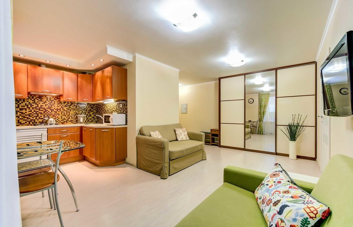 By type it is considered a one-room apartment, but in terms of area and functionality it is comparable to a two-room apartment: unlike a standard one-room apartment, in addition to one living room in a euro-apartment, it's not tiny kitchenette 6 sq., and spacious, combined with the living room.