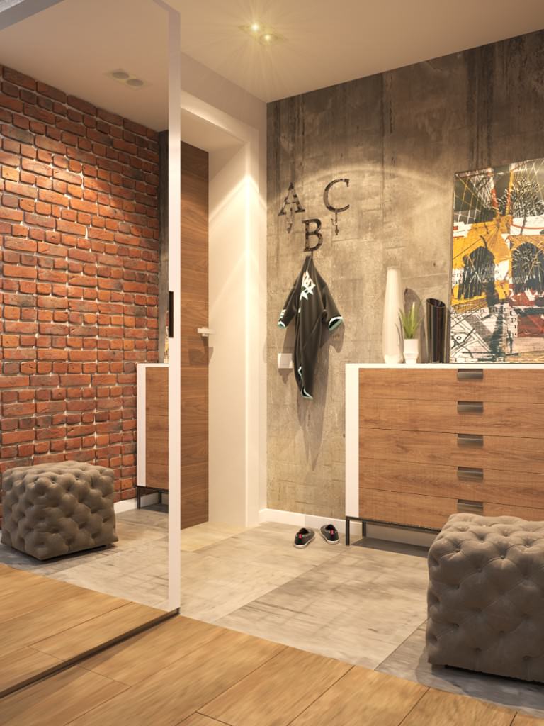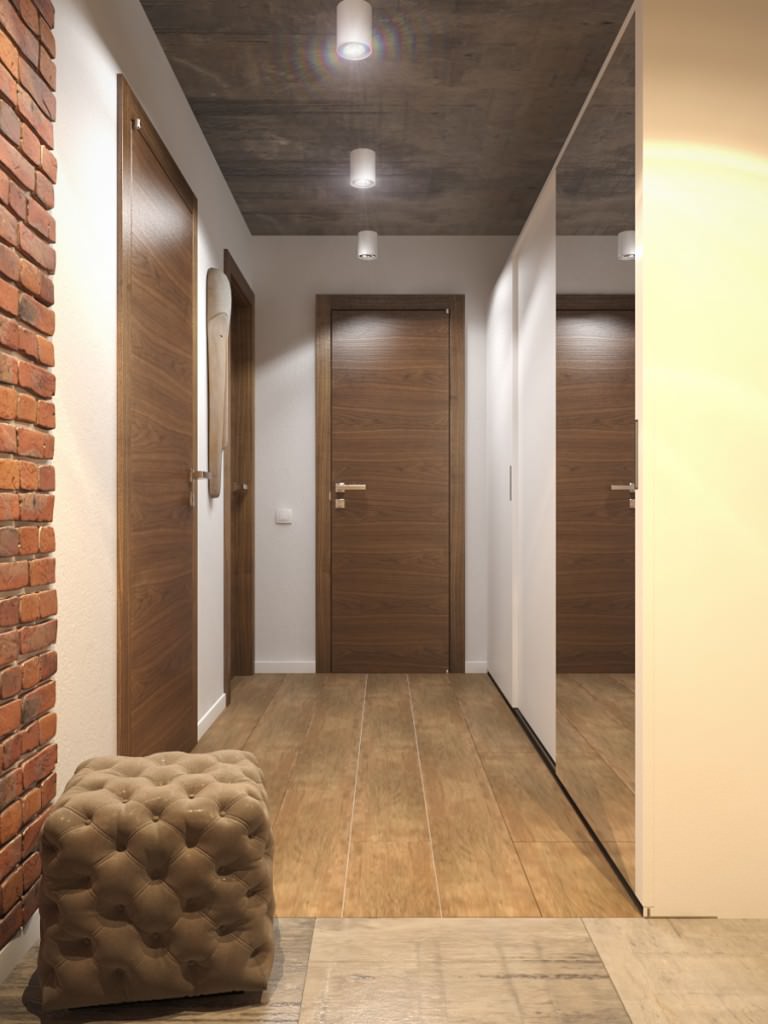 They did not close the ceiling, but left it concrete, removing the wiring in copper boxes - a stylish and modern solution. The walls were tiled with tiles imitating brickwork. The imitation is so precise that it feels like the walls are finished with decorative bricks.