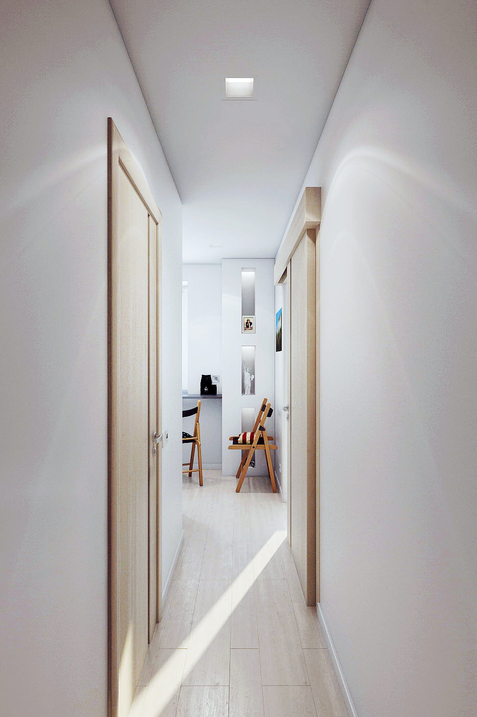In the interior of a 2-room apartment, the hallway and kitchen are connected by a corridor. A sliding door to the bedroom allows you to further expand the space and visually unite all the rooms in the apartment, except for the living room. Such isolation of the living room is quite justified, since quite often it plays the role of a guest bedroom.