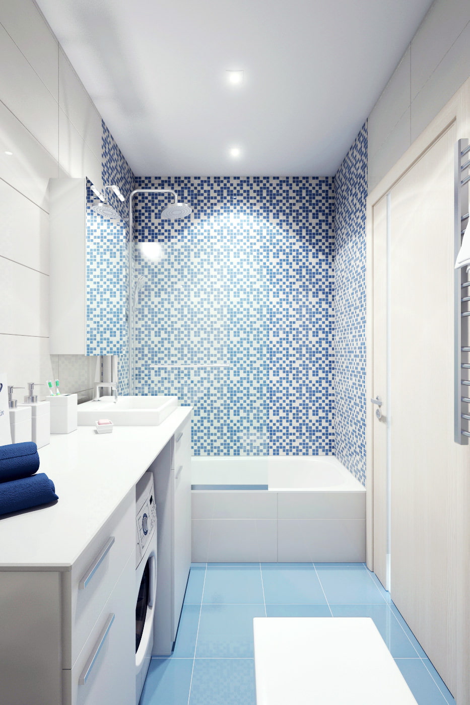 Behind the toilet, part of the wall is decorated with blue mosaic tiles. The theme of right angles in the design is supported by plumbing fixtures of an unusual shape: the bathtub, the sink, and even the toilet bowl here are rectangular!