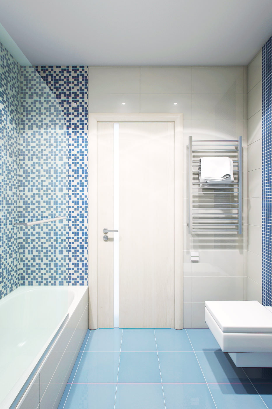 The soft blue floor perfectly matches the white walls and the “squeaky” pattern of the decorative tiles that line the walls surrounding the bathtub.