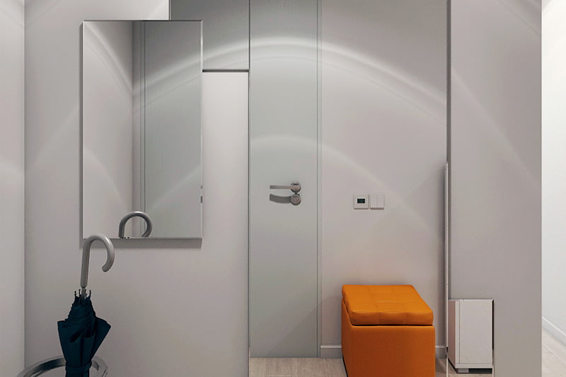 Acquaintance with the interior of a 2-room apartment starts from the hallway area. Immediately upon entering, guests are greeted by a bright orange pouf - the main and only decorative element of this zone.