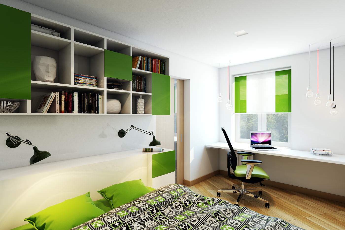 Green not only facades on closed shelves, but also curtains on the windows, and even an armchair. The poster on the wall above the bed and the bedspread are made in the same colors.
