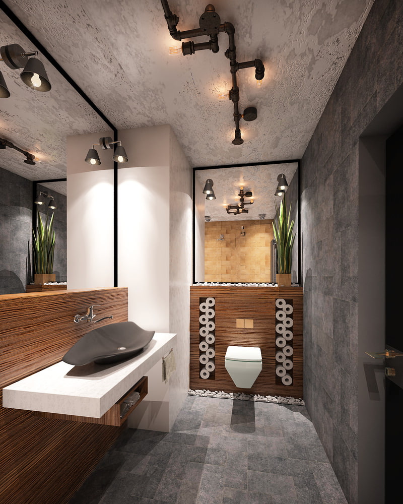 The luminaire on the ceiling is similar to the old pipes, painted black, which emphasizes the style common to the entire apartment.