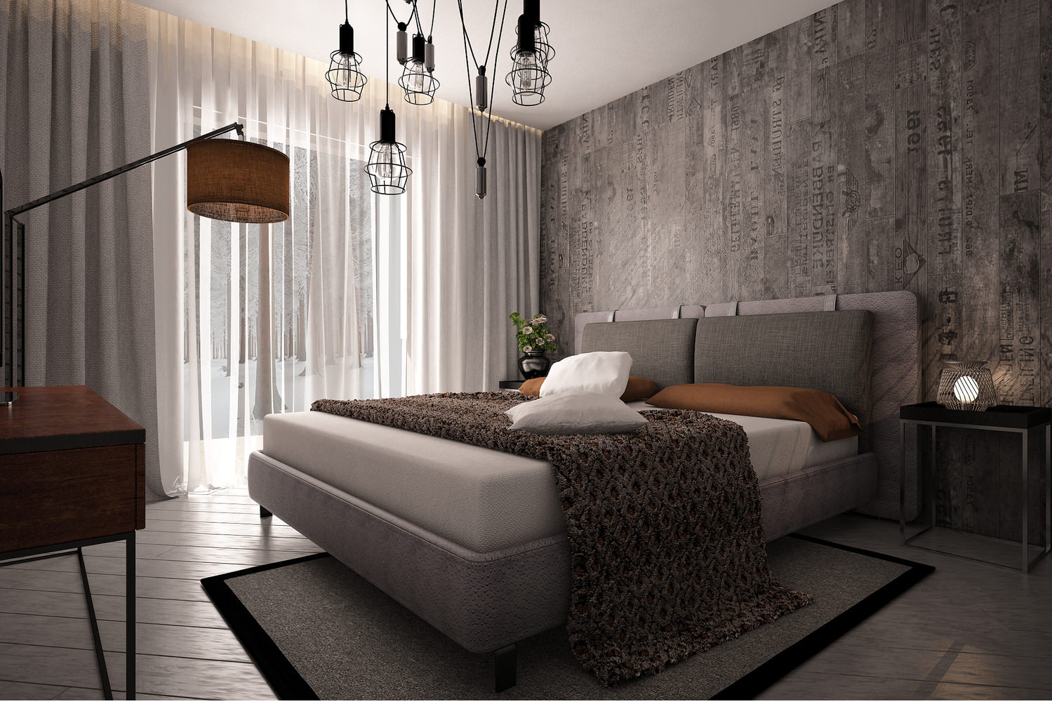 The loft style manifests itself as an exclusive “industrial” lamp above the bed.