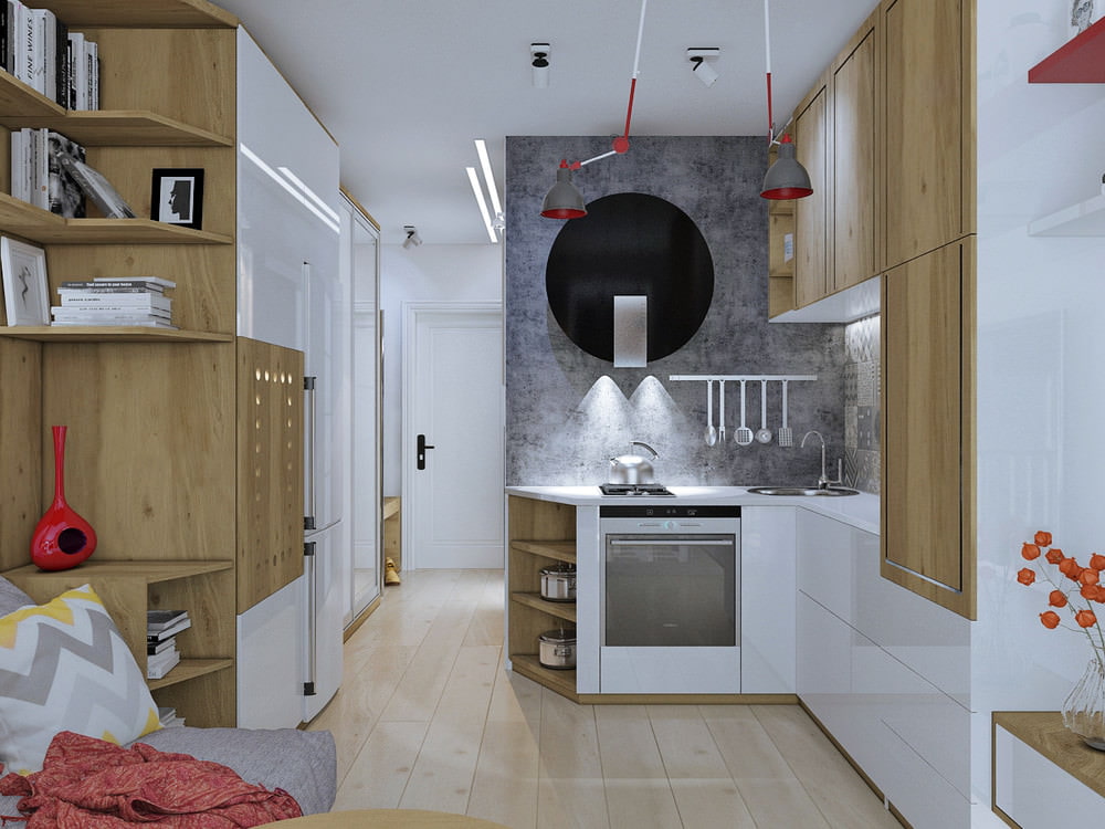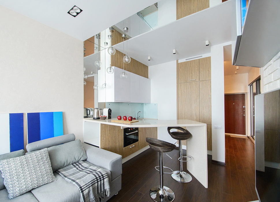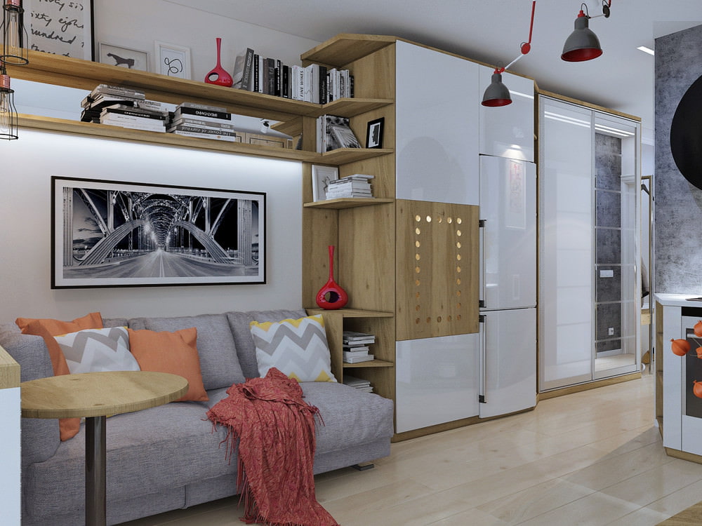 - Furniture. The kitchen is usually tied to communications and moving it to another place is not the most profitable solution. How do you arrange the furniture in the rest of the apartment? The bedroom-living room can be separated by a functional bar counter (it will also serve as a table) or a rack, which will act as an additional storage space. Opposite the bed, which should be placed close to the wall, there will be free space for a TV or desktop.