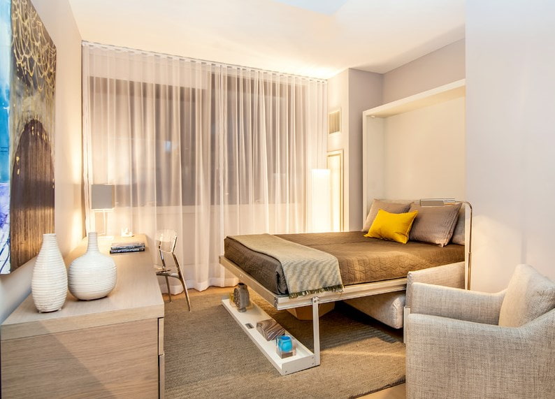 To save space, it is recommended to use transformable furniture on 18 square meters. In the design of a bed, a lifting mechanism for the bed is often used: under it is a wardrobe for storing things.