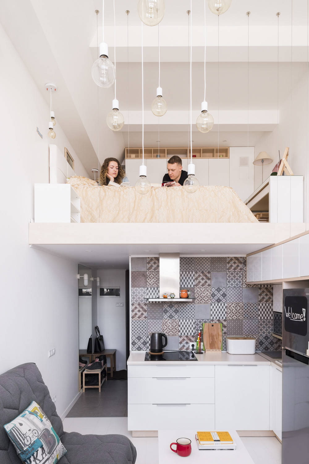 The photo shows a bright kitchen combined with a living room. Upstairs is a hanging bed that is only used at night.