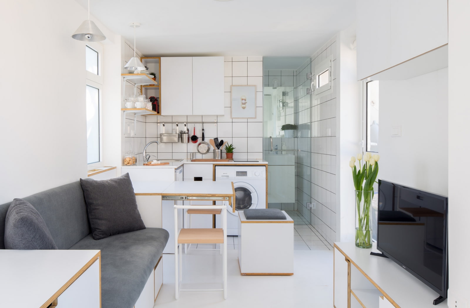 In the photo there is a minimalistic studio of 18 sq. m. in a modern style with transformable furniture.
