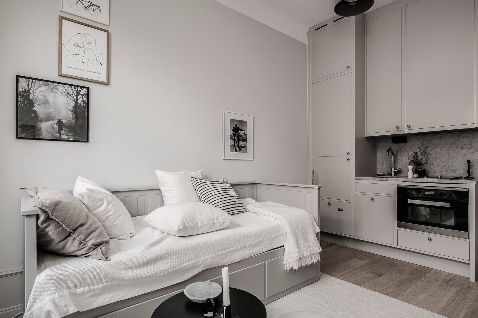 In the photo there is a studio with a gray sofa, which also serves as a bed. Cabinets, shelves and cabinets are used as storage places.