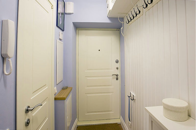 The bright entrance area with open hangers and shelves above them is laconic and airy. Narrow shoe rack from Ikea does not take up much space in width and serves as a console for small things. There are boxes for hats on the shelves - this makes the furnishings look much neater. Walls in hallway faced with clapboard and painted with Tikkurila, color H353. The storage area is separated by a curtain.