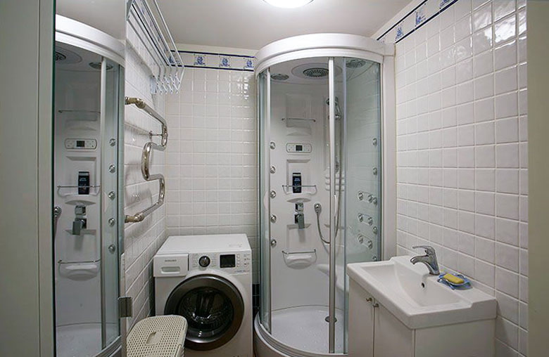 Bathroom area - 3.4 sq. m. After combining the bathroom and toilet, there was a place for a washing machine, and after replacing a bath with a shower - for a wardrobe and a laundry basket.