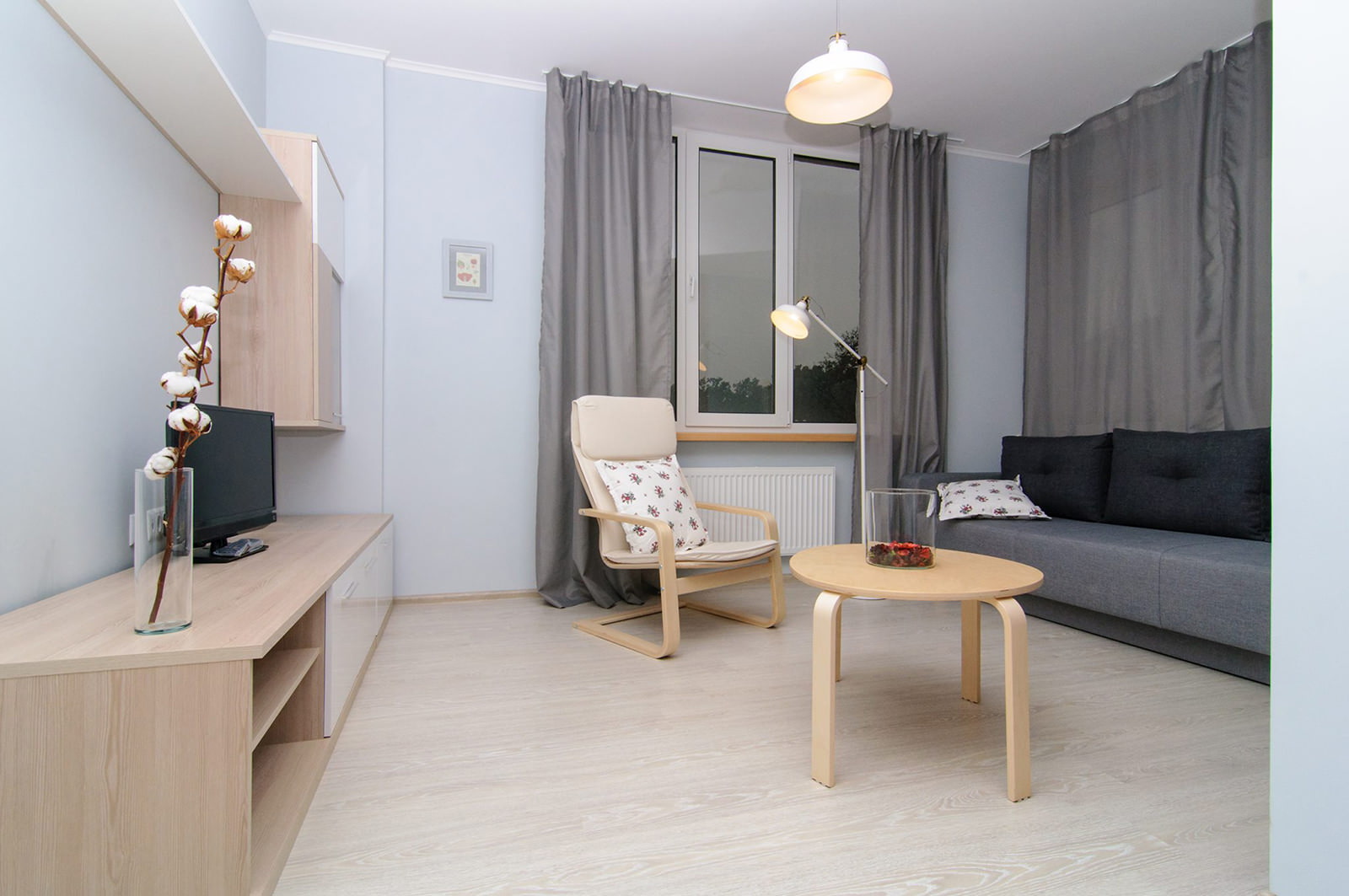 To visually expand the small room, the walls were painted in a light gray-blue tint. Cold light colors visually "push apart" the walls, and the white ceiling seems higher. Light wood floors, combined with matching furniture, add warmth and coziness while softening cold colors.