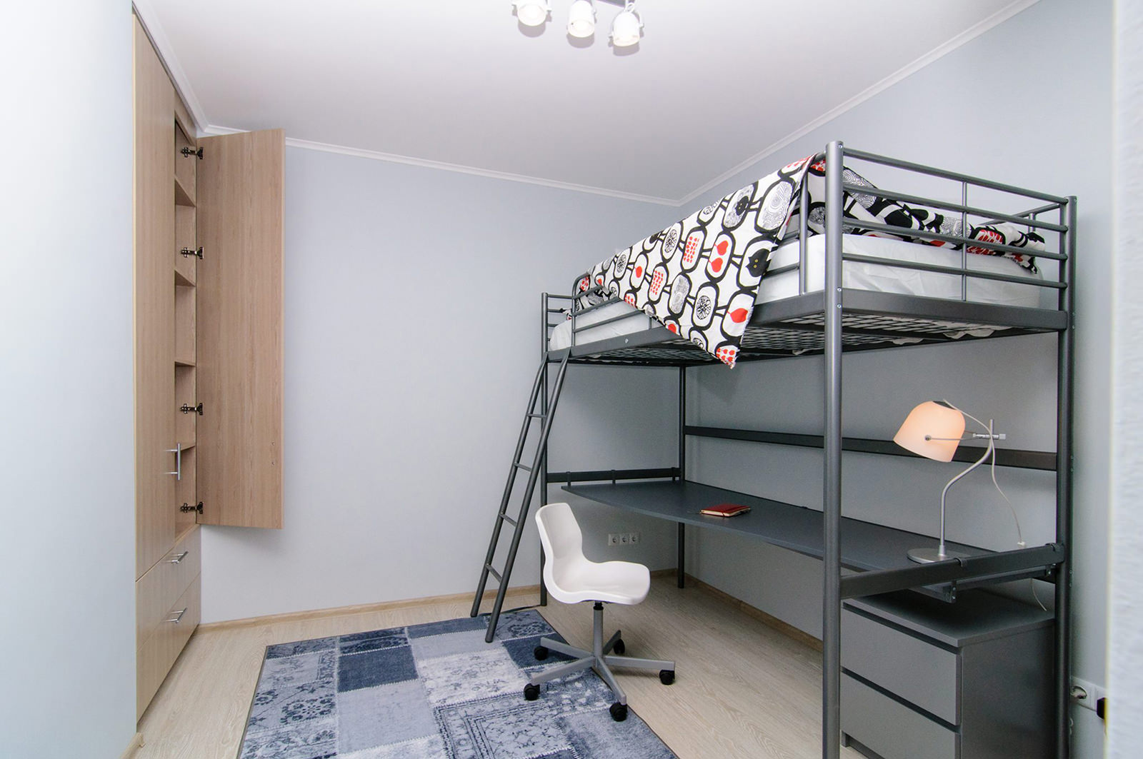The color scheme is calm, in harmony with the color of the walls - gray-blue. A rocking chair in the living area is a luxury item that adds comfort. It is very pleasant to relax in it and spend time reading books or watching TV programs. A bed in the nursery on the “second floor” above the working area is a decision dictated by a lack of space. But children are so fond of climbing somewhere upstairs for rest!