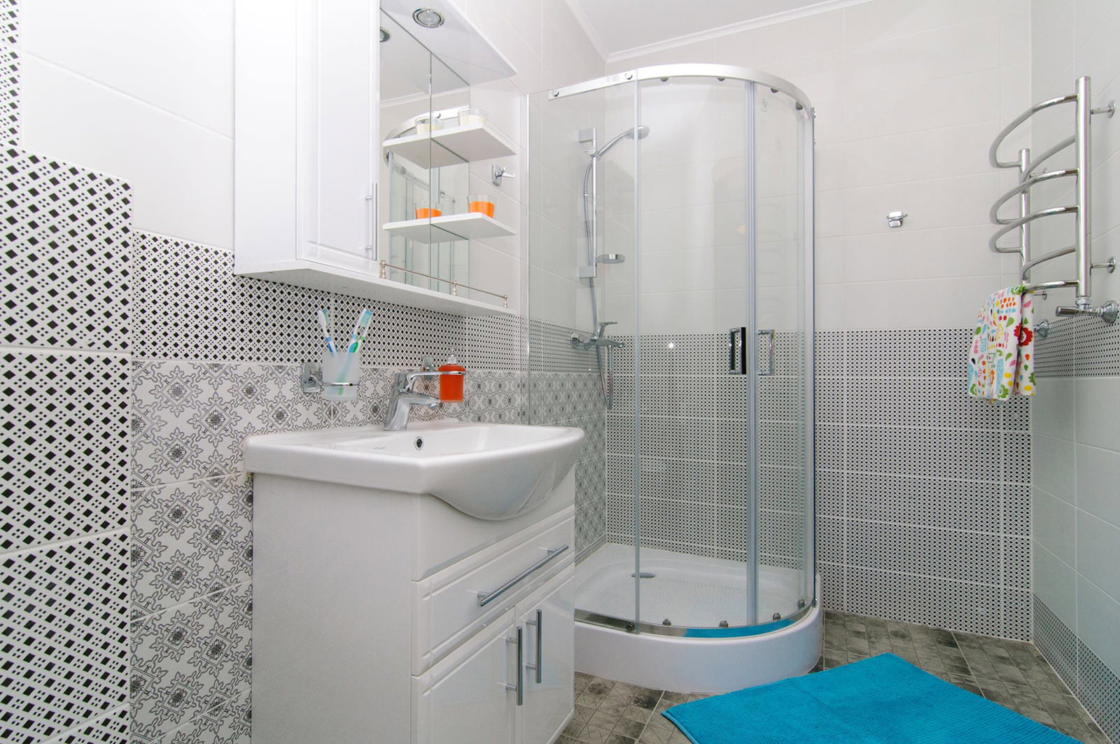 Combining a toilet and a bathroom made it possible to increase the area and put everything that a modern person needs here. Actually, the bath itself as such is not here, for the sake of saving space it was replaced with a shower cabin, the transparent walls of which seem to “dissolve” in the air and do not clutter up the room. Monochrome ornaments on the tiles not only refresh, but additionally zone the bathroom.