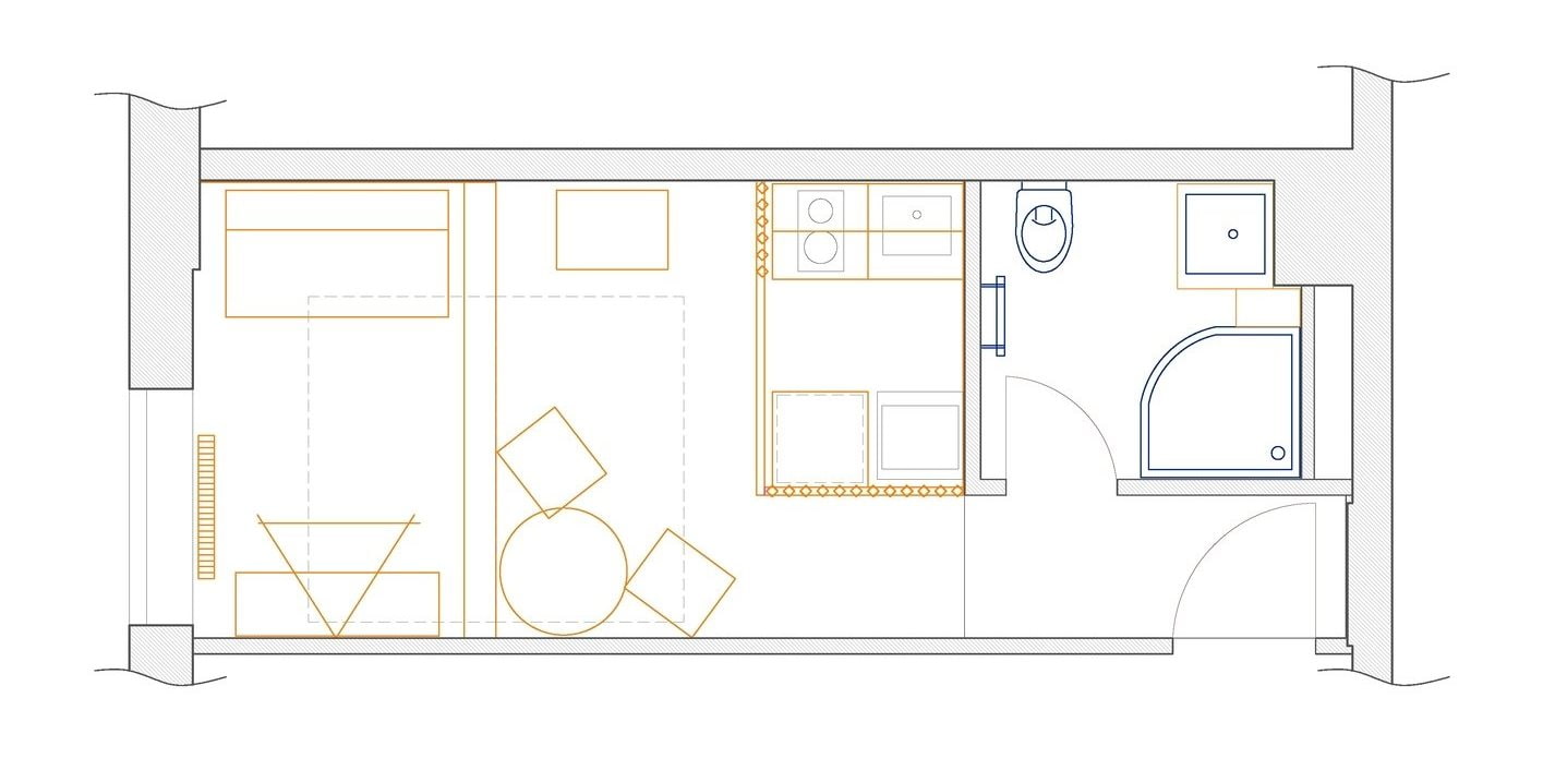 The rectangular apartment consists of one room and a bathroom. Opposite the entrance is the bathroom door. A small corridor leads to the kitchen area, which flows smoothly into the living space. The room is divided by a wooden podiumthat performs several functions at once.