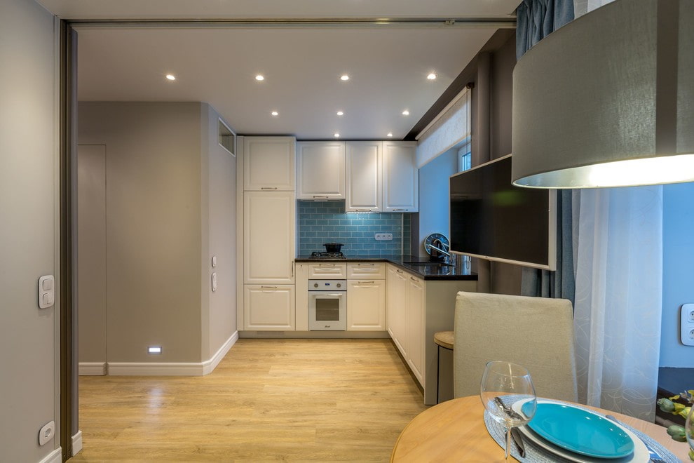 The walls are decorated in light gray tones, and the floors are decorated with quartz vinyl tiles with wood grain. The ceiling is made of tension and is equipped with built-in lights. They are not in vain arranged in a grid: this technique gives more light, visually adding space.