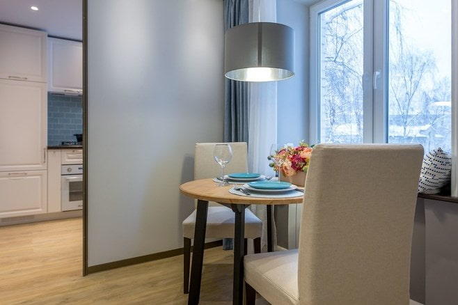 A hanging chandelier is provided for local lighting in the dining area, which can be moved when the table is moved, and a floor lamp is located near the soft sofa.