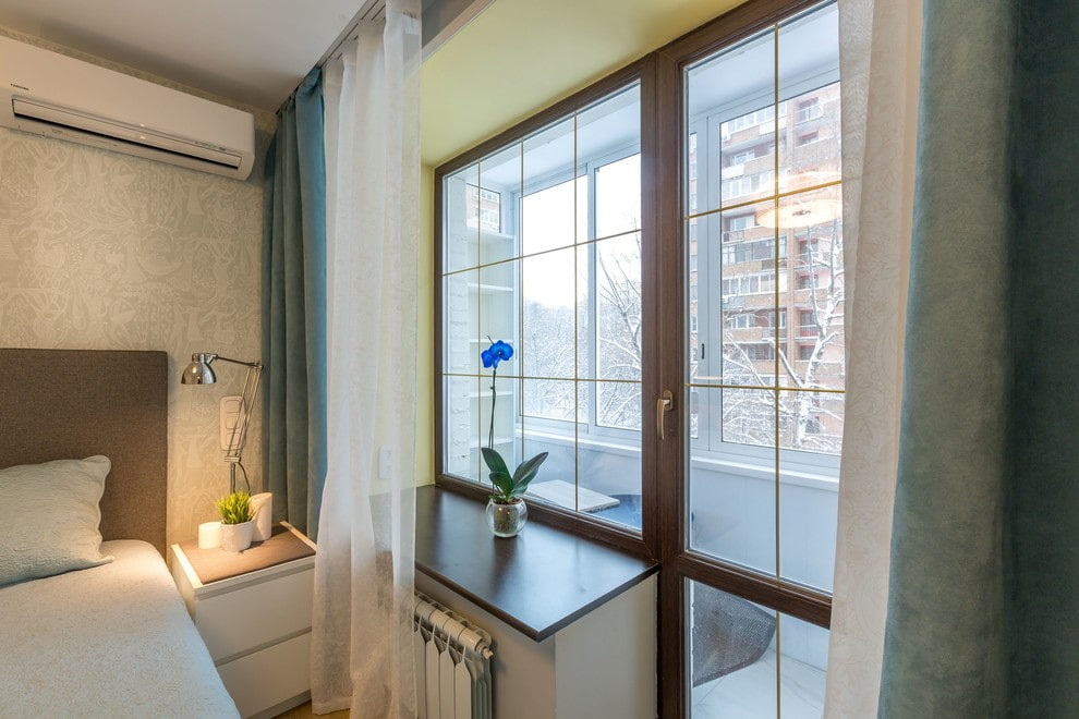 The window overlooking the balcony was decorated with wood-like frames, and the glass was decorated with a crate: the opening began to look original and noble. The slopes were painted yellow - so even in cloudy weather it seems that the sun is outside the window.