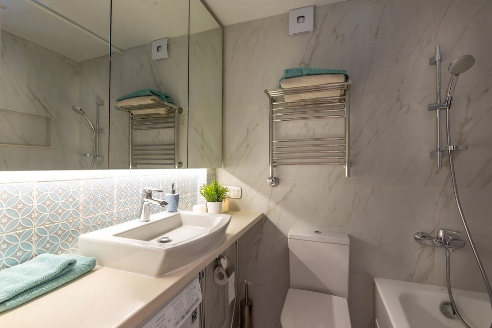 A 13 cm deep mirror cabinet was hung over the sink: it does not interfere with washing and serves as a storage place for cosmetics. The bright bathroom is tiled with marbled tiles.The window between the bathroom and the kitchen was left, changing only the shape: this is how natural light enters the room.
