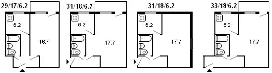 The total area of one-room apartments is from 29-33 square meters, living area is from 16 to 20 m2, kitchen size is 5-6 m2.