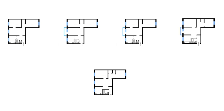 - Each floor occupies 3 apartments - one-room, two-room and three-room types.