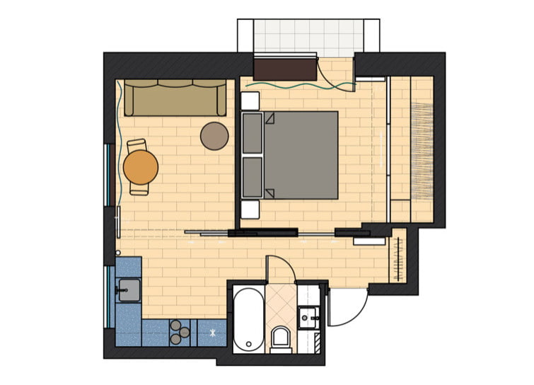 The apartment occupies only 34 square meters, but in terms of functionality it is not inferior to a full-fledged two-room apartment. The owner of the small size is a young girl marketer.