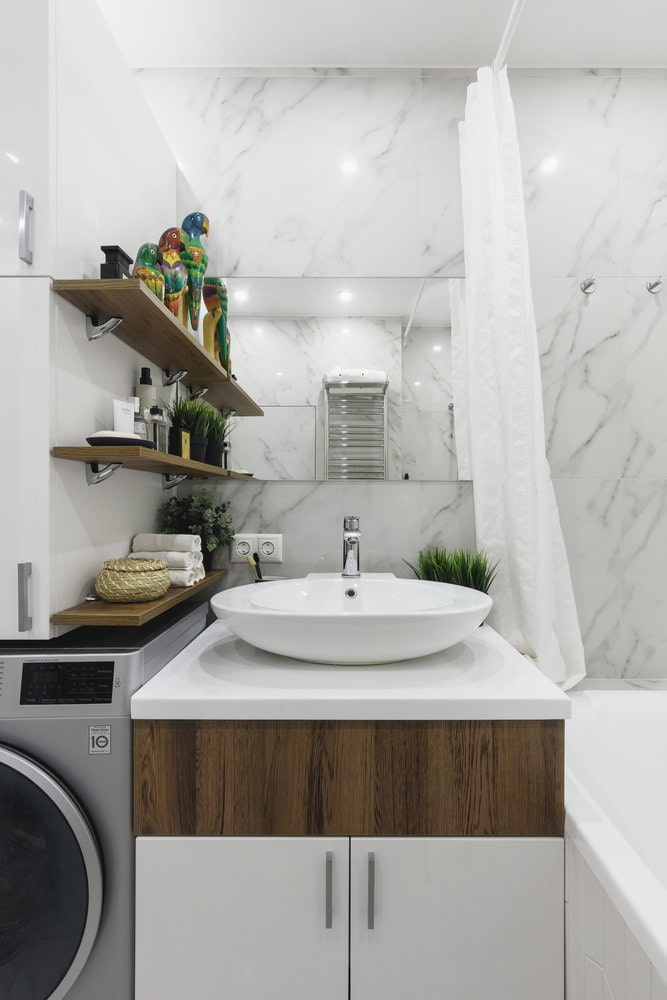 Having issued a bathroom, the designers achieved the almost impossible by fitting a countertop with an overhead sink and a washing machine, a toilet and a bathroom. The space is expanded by a wall cabinet with mirrored doors.