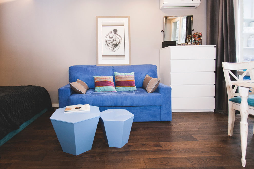 The main decoration of the wall in the living area is the work of the famous portrait photographer Howard Schatz. The bright blue sofa is made to order: it is quite small and, if necessary, folds out into a sleeping place.
